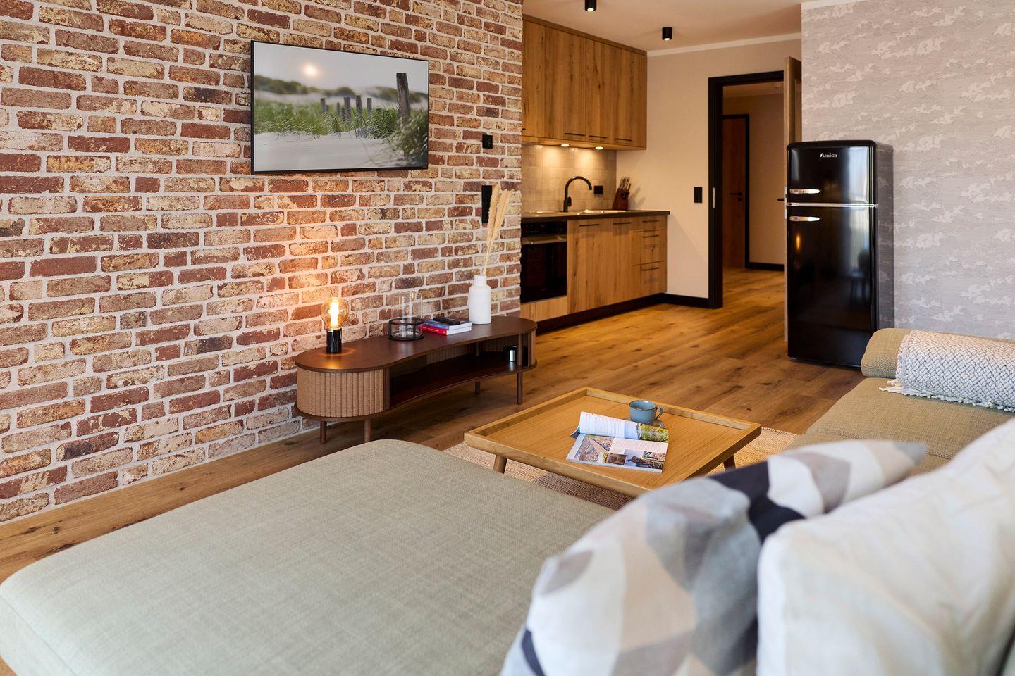 Gemütliches Apartment im Binnendiek Resort in Sankt Peter-Ording mit Wellnessbereich und Balkon, ideal für erholsamen Nordseeurlaub.