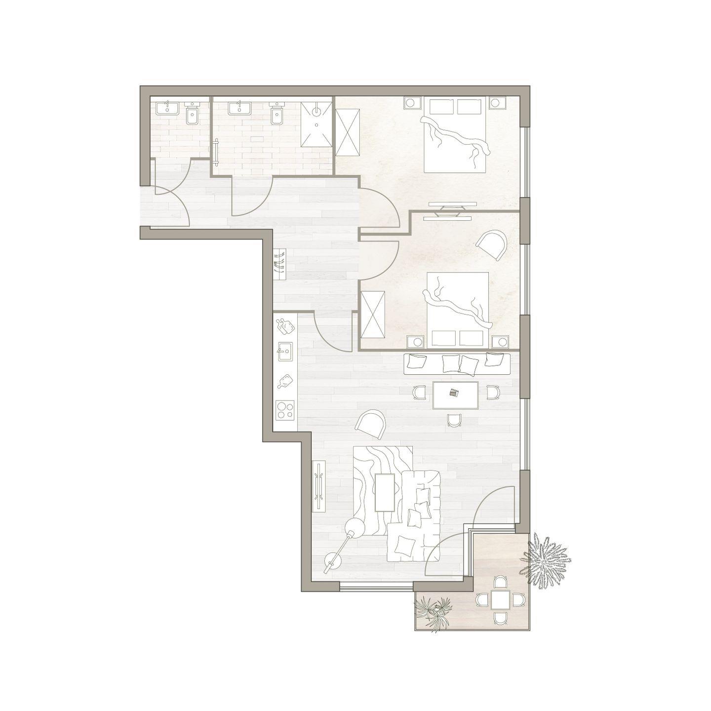 Der möblierte Süd-Balkon bietet fast den ganzen Tag lang Sonne. Die zwei Schlafzimmer sind mit je einem komfortablen Doppelbett, Schrank und Smart TV ausgestattet. Zudem verfügt das Apartment über ein modernes, mit anthrazitfarbenen Natursteinfliesen gestaltetes Badezimmer und ein separates WC.
