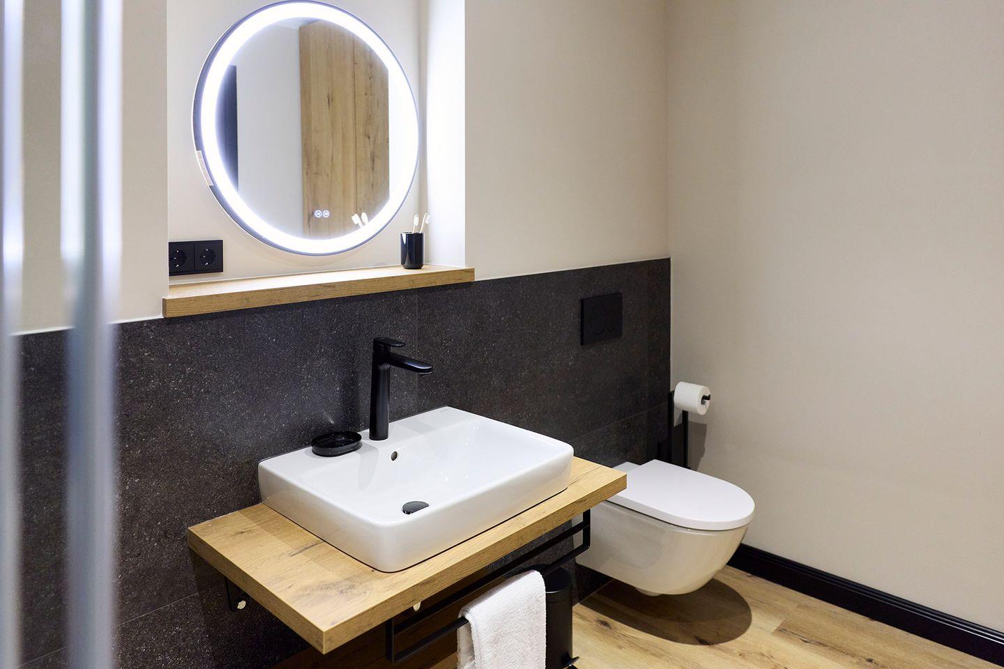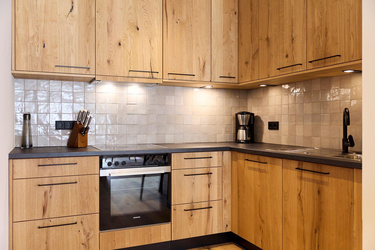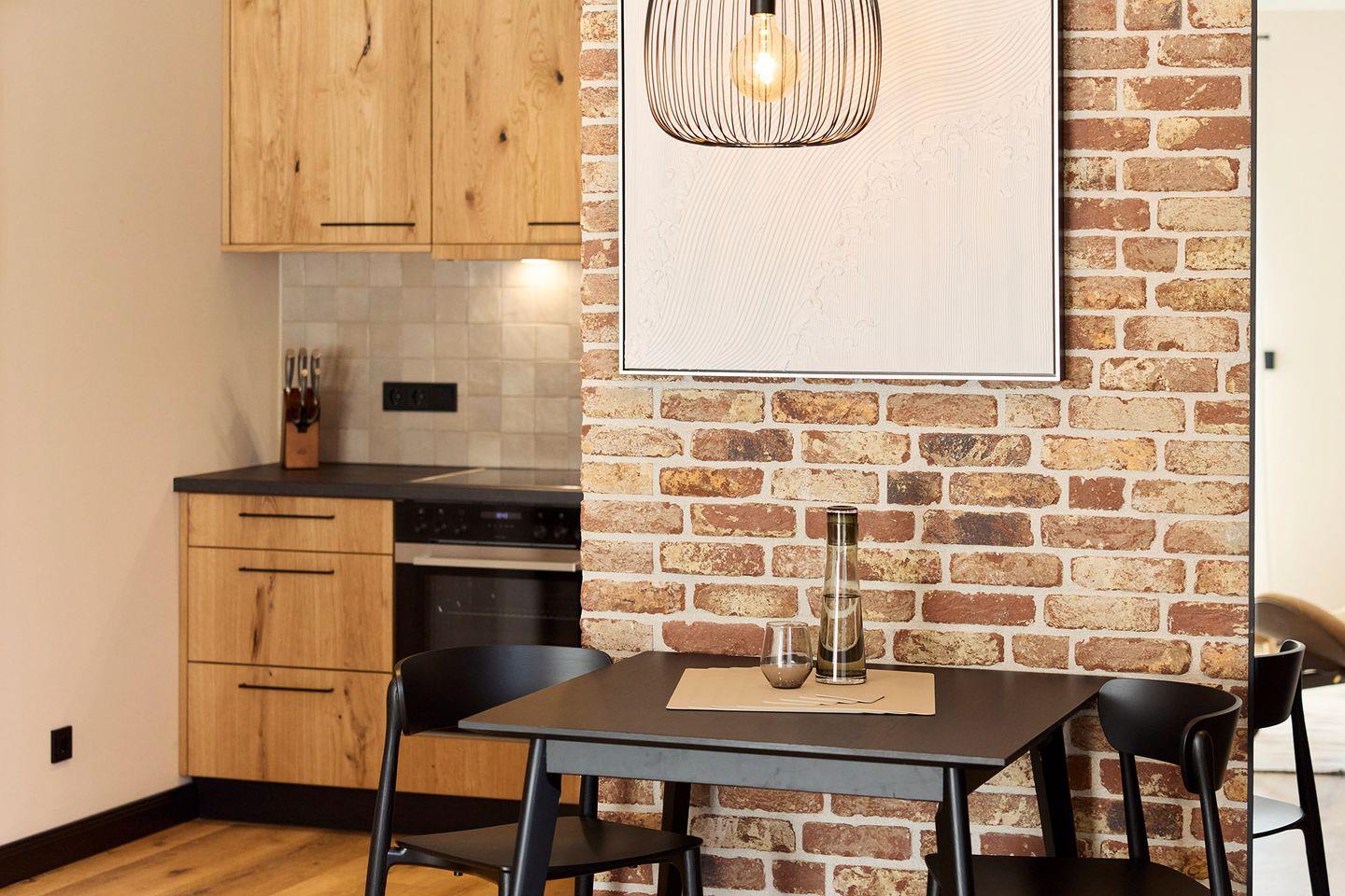 Der offen gestaltete Wohn-Essbereich mit integrierter Küche wird von zwei Seiten mit Tageslicht durchflutet. Der kleine Essplatz ist ein Ort zum Zusammensein ebenso wie die gemütliche Sofaecke in hellem Naturton. Eine große, möblierte Dachterrasse und ein separater Balkon bieten Sonne bis in den Abend hinein. Das Schlafzimmer ist mit einem komfortablen Doppelbett, Schrank und Smart TV ausgestattet. Zudem verfügt das Apartment über ein modernes, mit anthrazitfarbenen Natursteinfliesen gestaltetes Badezimmer.