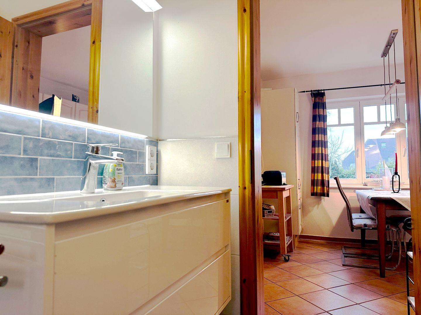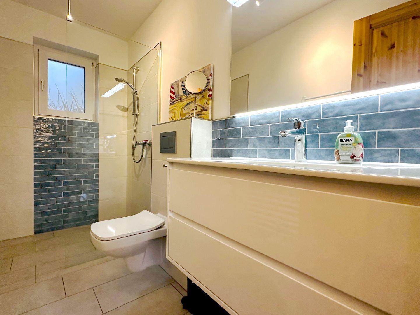 Das moderne Badezimmer verfügt über eine ebenerdige Dusche und überzeugt durch seine zeitgemäße Ausstattung.