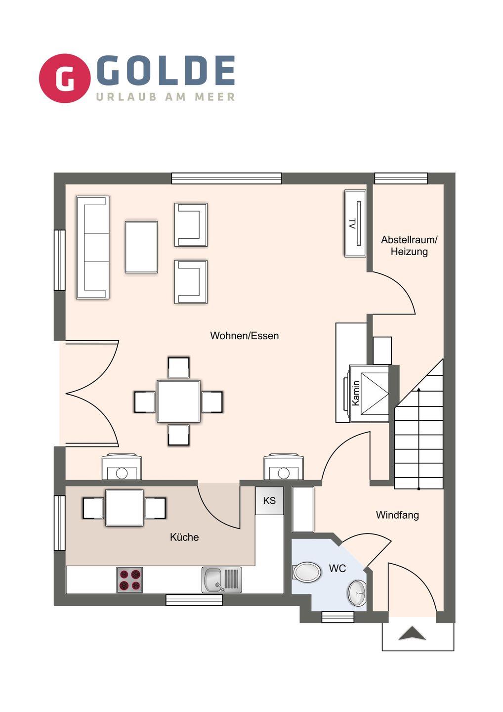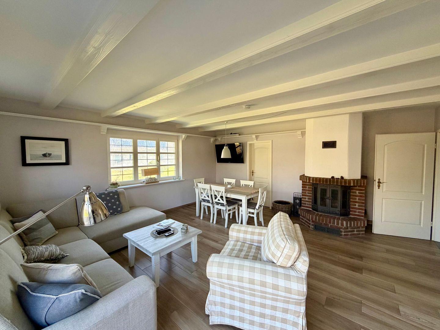 Im Erdgeschoss befindet sich der lichtdurchflutete Wohnraum mit einem Kamin, TV sowie einem gemütlichen Essbereich.