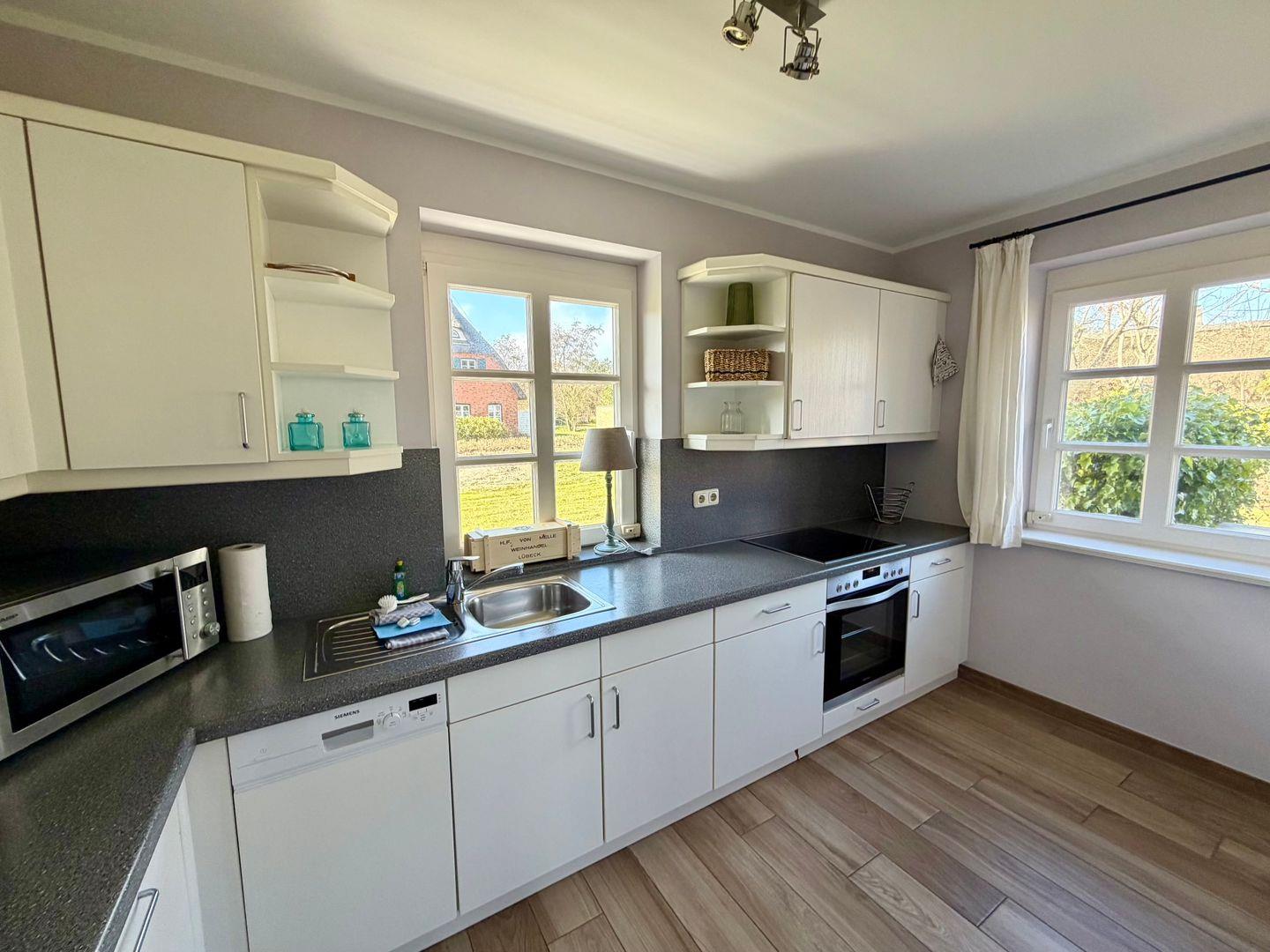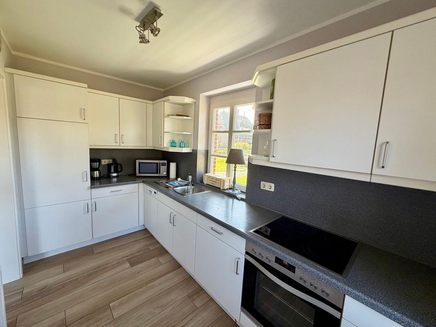 Die separate Küche ist mit allen wichtigen Geräten voll ausgestattet. Ebenso ist im Erdgeschoss ein geräumiger Flur und ein Gäste-WC.