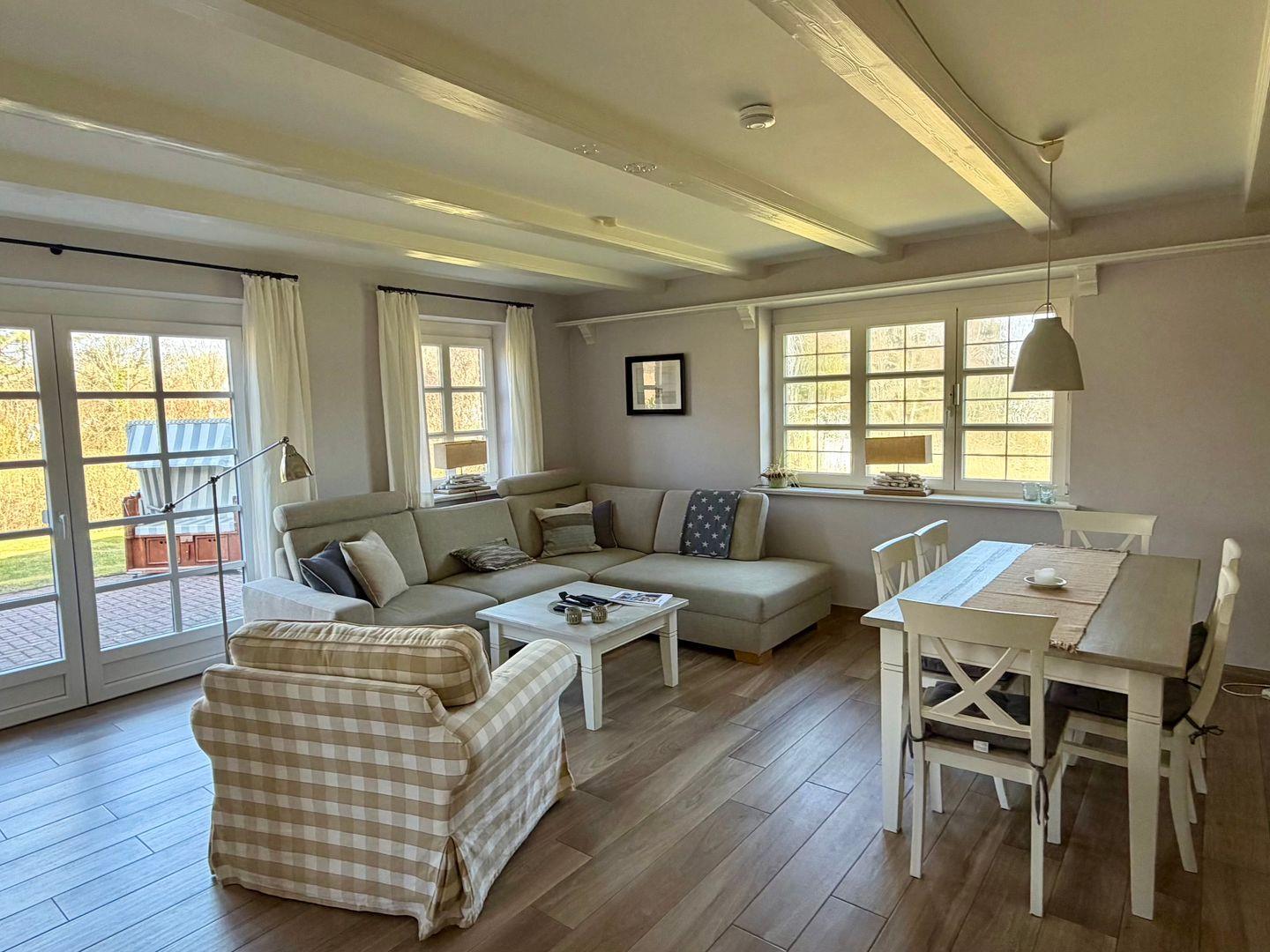 In dem wunderschönen und liebevoll angelegten Garten und der gemütlichen Terrasse können Sie Ihren Urlaub ab der 1. Minute genießen. Gartenmöbel und ein Strandkorb laden Sie zur Erholung ein.