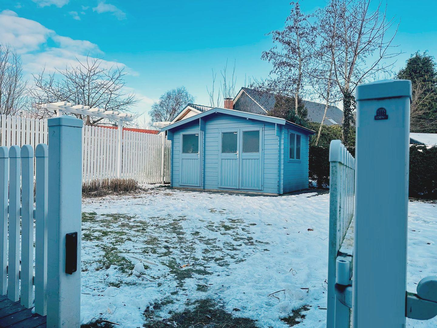 Abgeschlossenes Grundstück mit Gartenmöbeln, Parkplatz und Gartenhaus vorhanden.