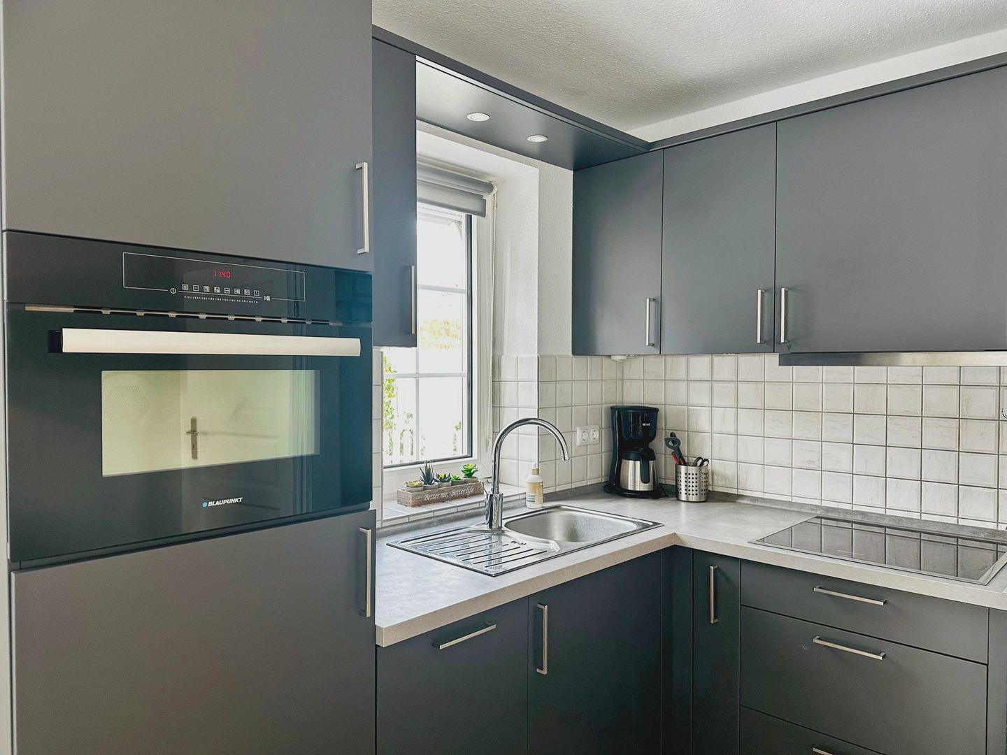 Charmantes Reihenendhaus mit ca. 65 m², 3 Zimmern und offenem Wohn-/Küchenbereich. Moderne Küche mit Geschirrspüler, Backofen, Cerankochfeld sowie Kaffeemaschine, Wasserkocher und Toaster.