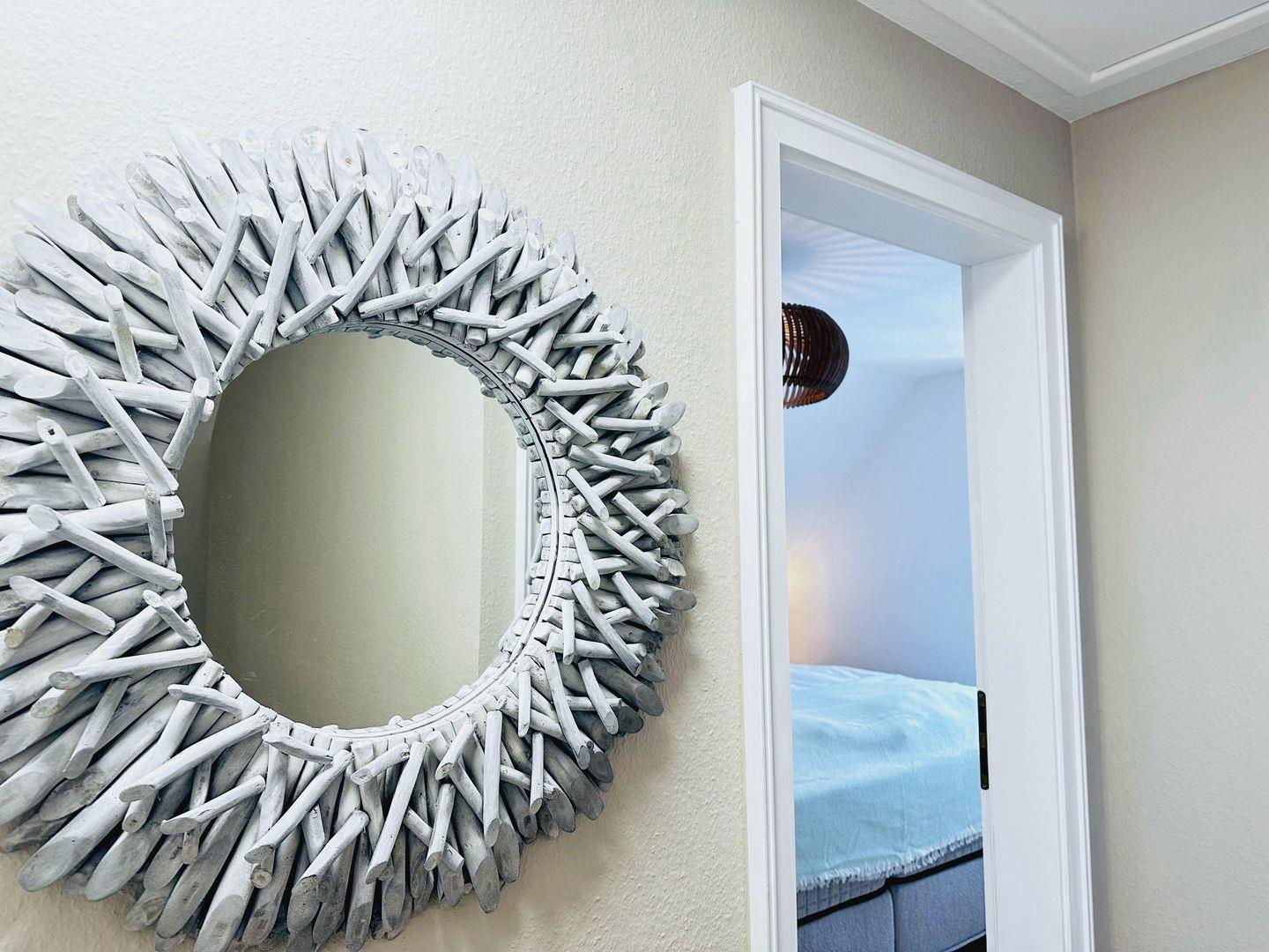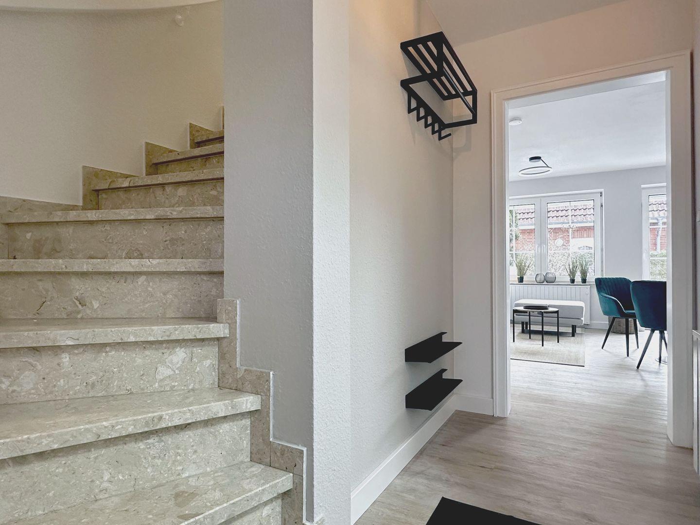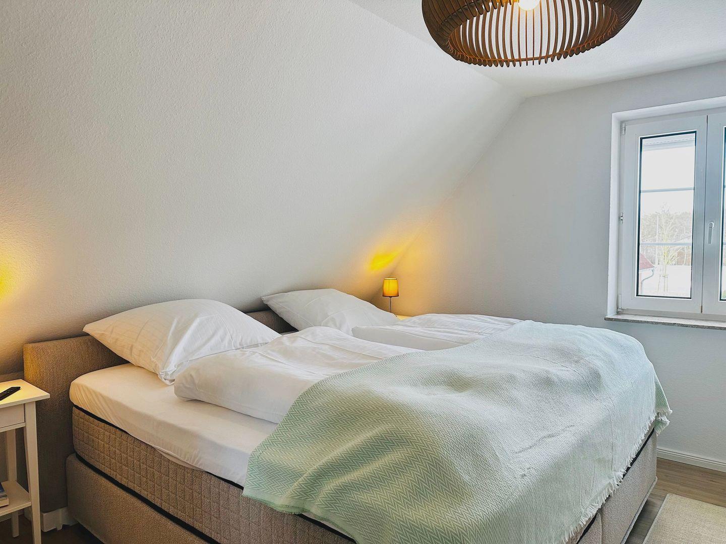 Über eine geschlossene Treppe gelangen Sie ins Obergeschoss. Dort erwarten Sie zwei Schlafzimmer mit bequemen und hochwertigen Boxspringbetten. Beide Zimmer verfügen über Kleiderschränke, Verdunklungsmöglichkeiten und einen Smart-TV.