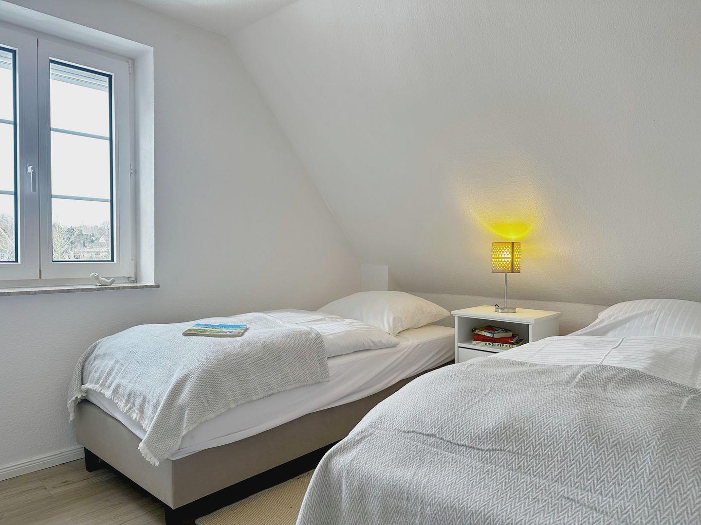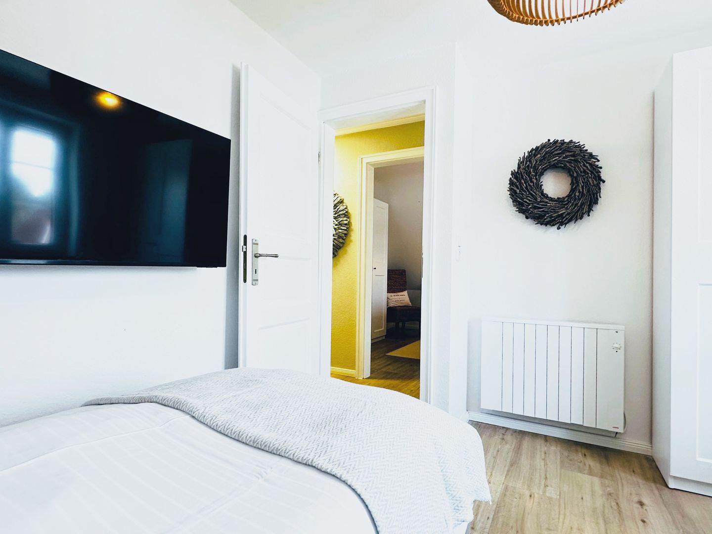 Zwei Schlafzimmer im Obergeschoss, jeweils mit Kleiderschrank, Verdunklung und TV.