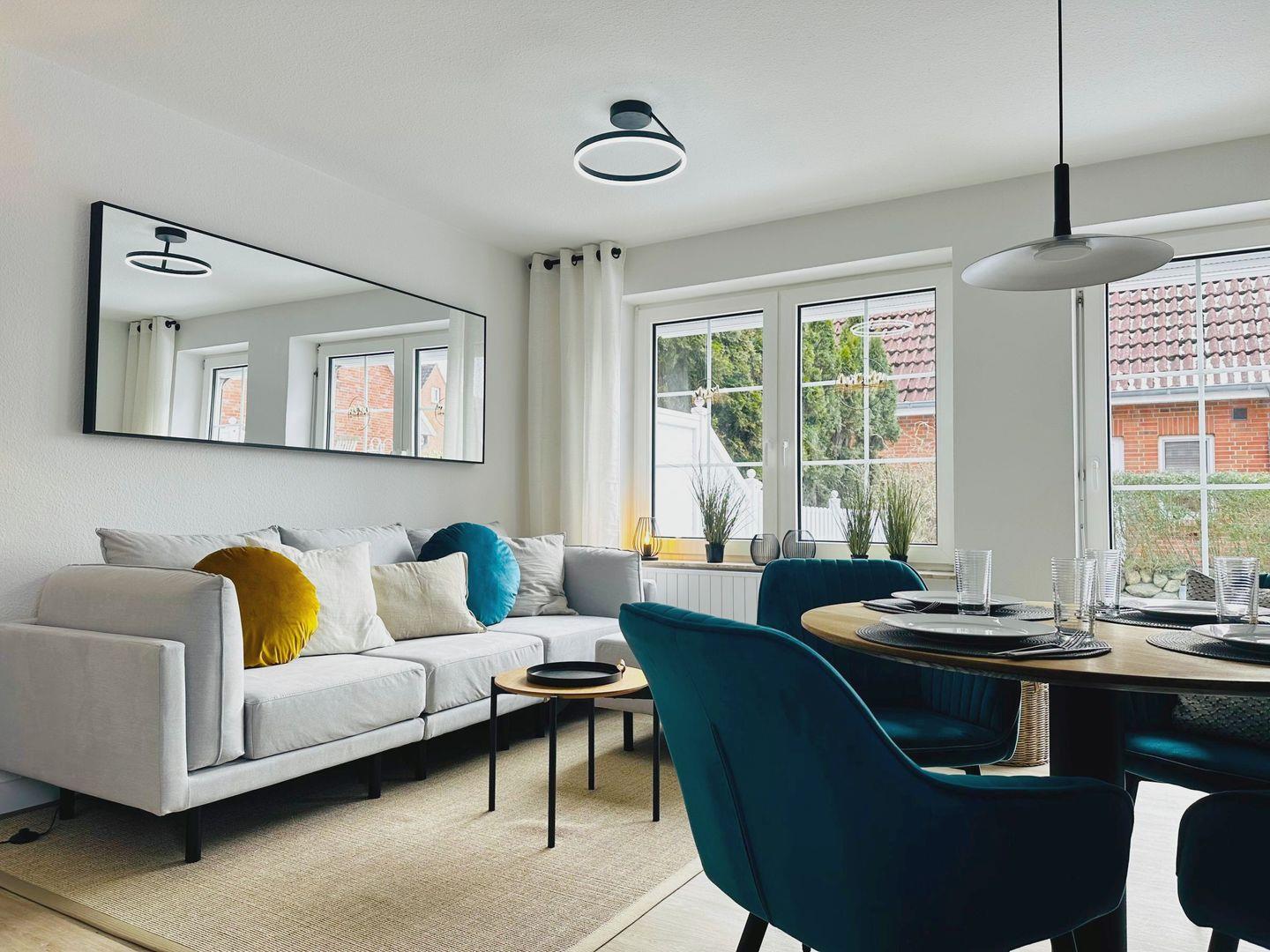 Auf etwa 65 m² bietet das Haus drei Zimmer sowie einen offenen Wohn- und Küchenbereich, der modern und gemütlich eingerichtet ist. In der Küche finden Sie alles, was Sie für den Alltag brauchen, darunter Geschirrspüler, Kombi-Backofen mit Mikrowellenfunktion, Cerankochfeld, Kaffeemaschine und Wasserkocher.
