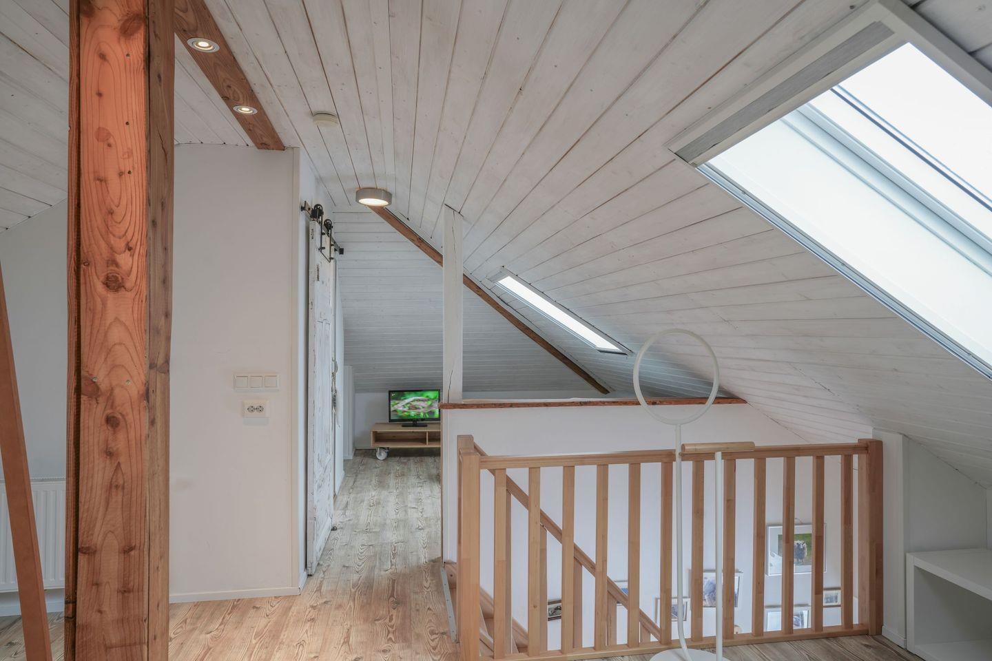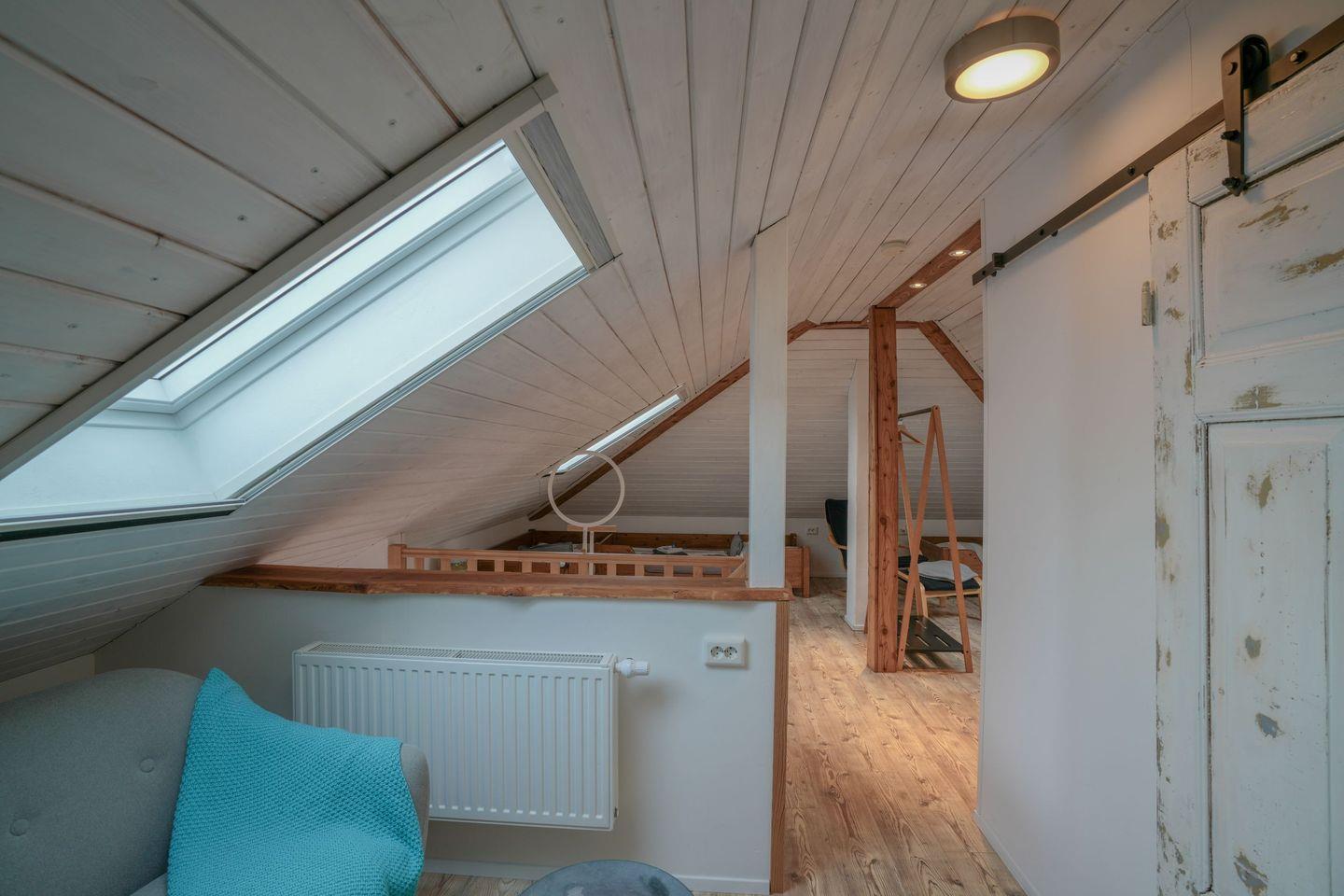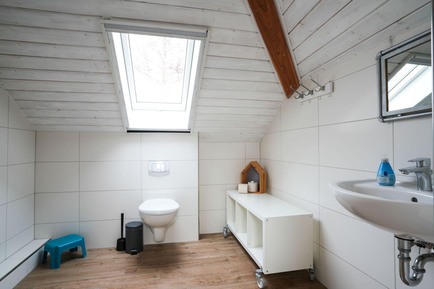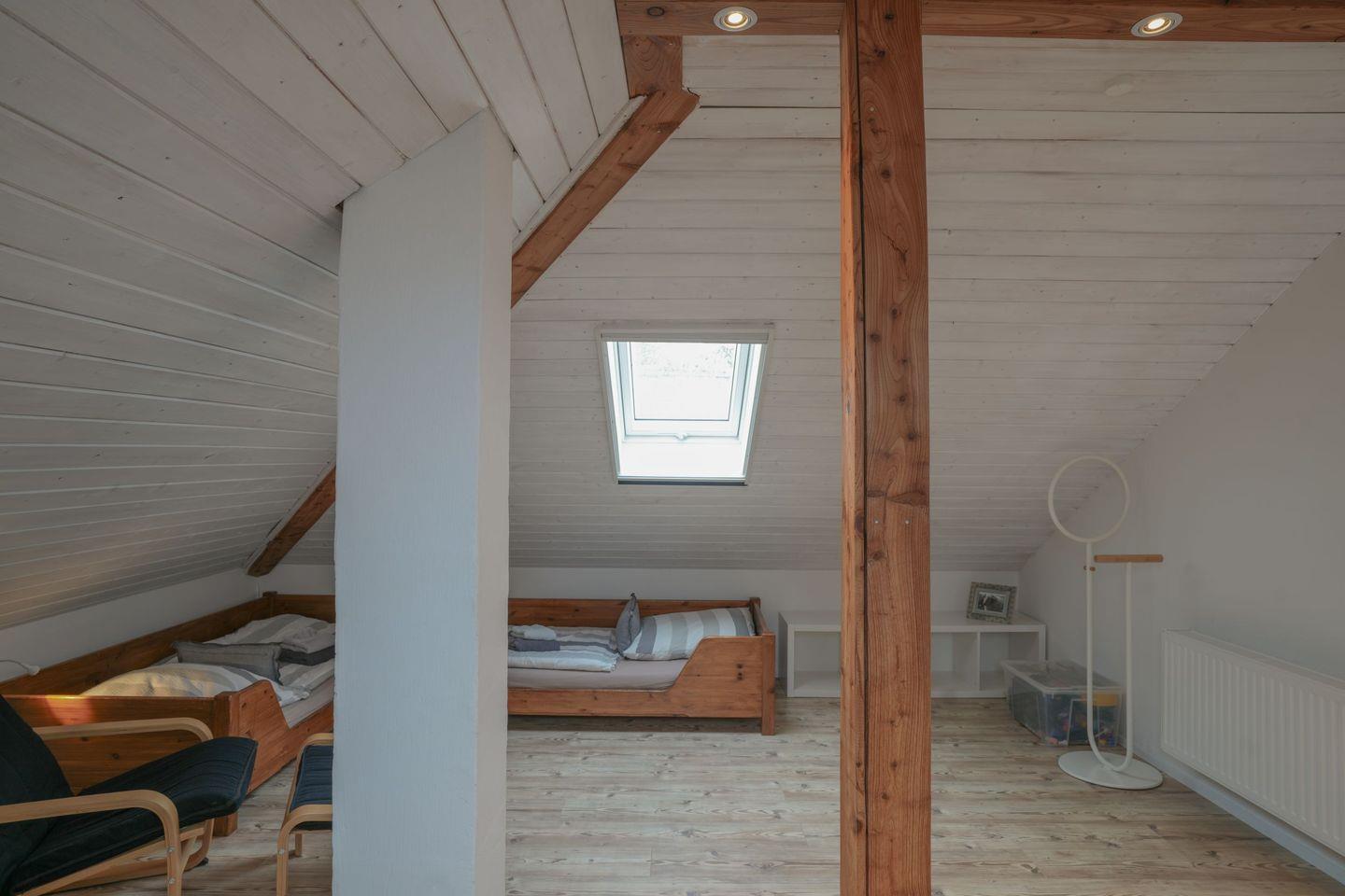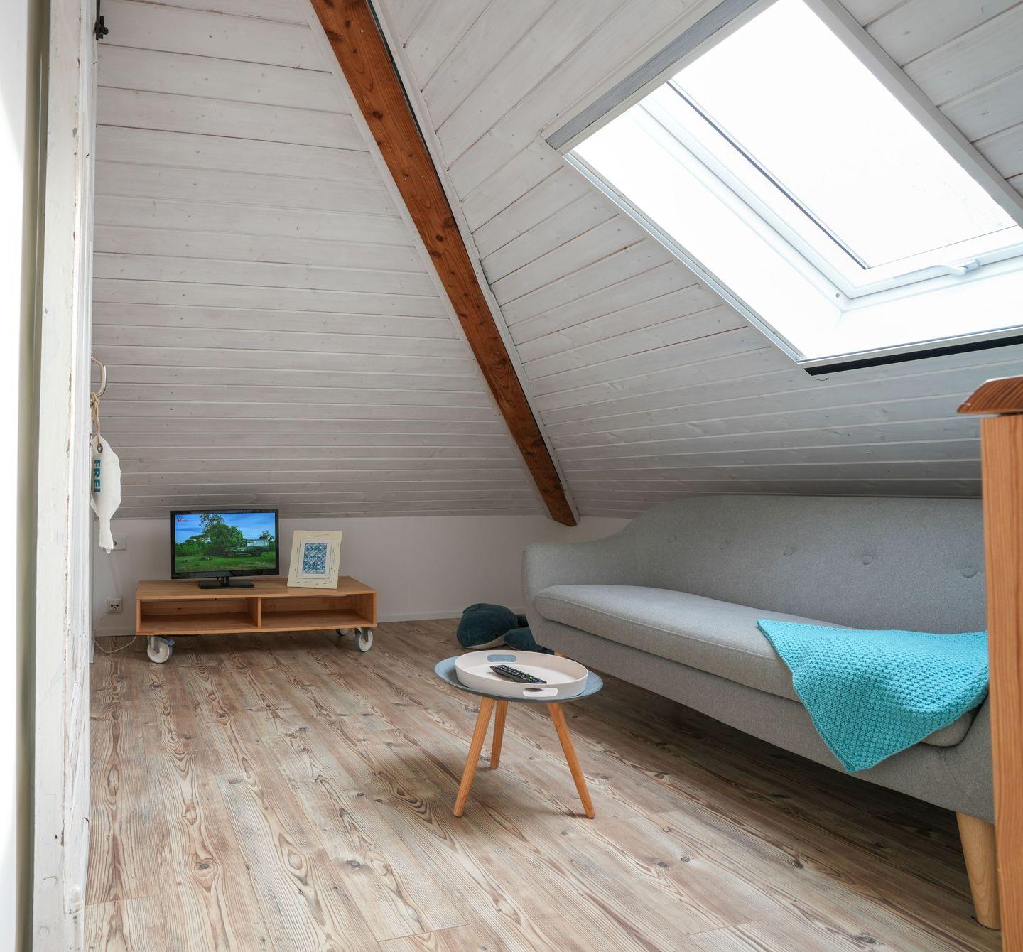 Im Obergeschoss befindet sich der große Schlafboden, aufgeteilt in einen Schlafbereich mit vier Betten und eine gemütliche Leseecke, ideal zum Träumen und Entspannen. Ein weiteres Badezimmer steht hier ebenfalls zur Verfügung. Alle Schlafräume sind mit einem Fernseher ausgestattet.