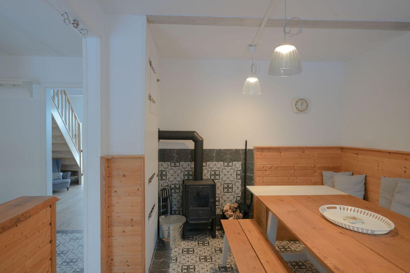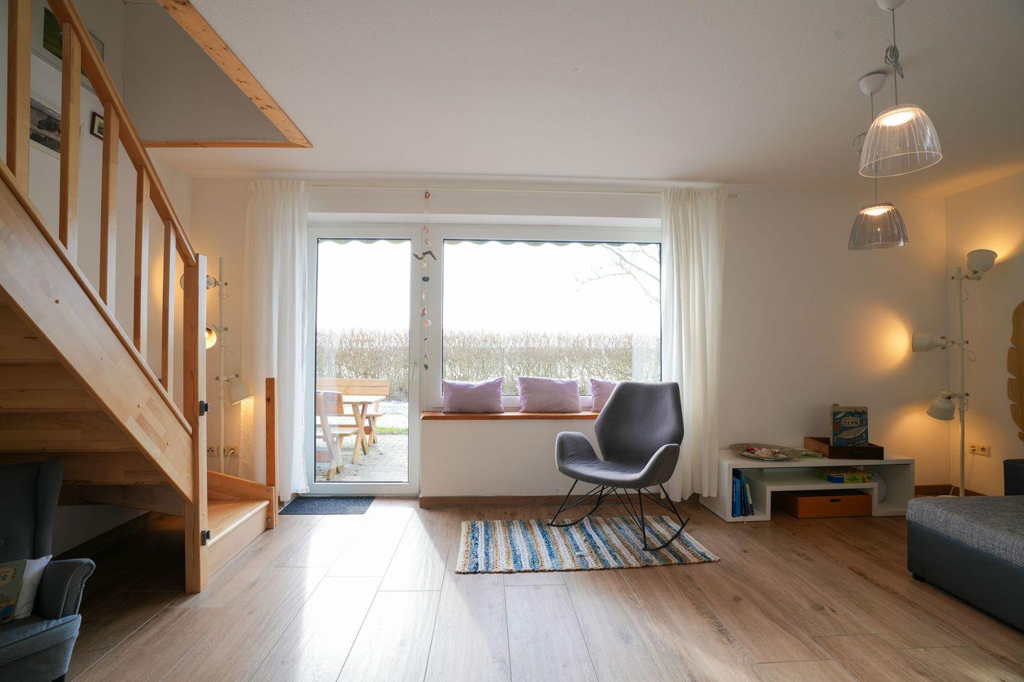 Das großzügige Wohnzimmer, liebevoll „Beste Stuv“ genannt, ist mit vielen gemütlichen Sitzgelegenheiten ausgestattet, darunter ein großes Sofa, ein Ohrensessel und ein Schaukelstuhl. Von hier aus gelangen Sie direkt auf die Terrasse und in den weitläufigen Garten mit Blick über die Felder – ein wunderbarer Ort zum Abschalten und Durchatmen.