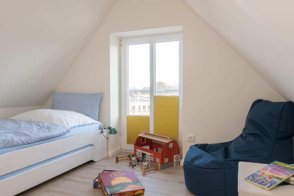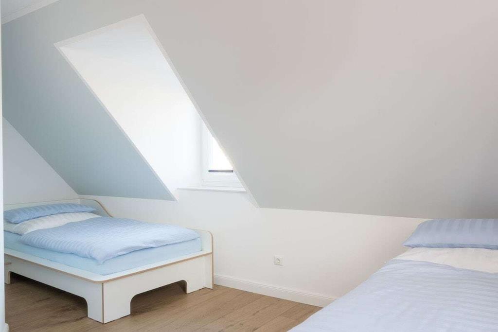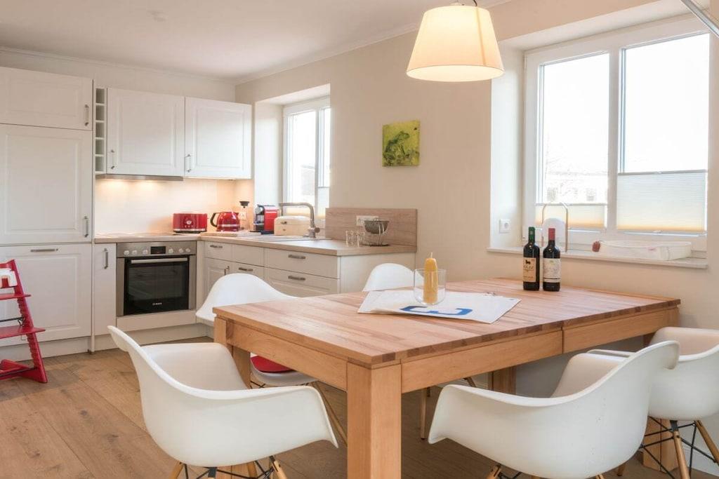 Wir heißen Sie herzlich willkommen in Ihrem Ferienhaus "Grüppenhus", das wir nach den Deichvorflutern, den "Grüppen", benannt haben. Treten Sie ein und fühlen Sie sich wie zu Hause: auf 76 qm erwartet Sie alles, was man für einen unvergesslichen Urlaub an der Nordsee benötigt. Zu Ihrem Komfort auch im Winter sind alle Räume mit Fußbodenheizung ausgestattet, Wohn- und Schlafräume im EG und in der ersten Etage verfügen über Holzfußböden. Im Erdgeschoss finden Sie den Wohn-/Essbereich mit umfangreich ausgestatteter Küche, Essplatz mit 5 Stühlen, 2 Tripp-Trapp-Kinderstühlen (bei Bedarf), gemütlichem Multifunktionssofa, Kaminofen, Smart-TV, Bluray-Player und Spielkonsole (Wii-U), ein Duschbad mit WC und den Hauswirtschaftsraum. Unsere Küche ist mit dem ausgestattet, was uns lieb ist: Cerankochfeld, Backofen, Spülmaschine, sowie Kühlschrank mit separatem Gefrierfach. Weiter bieten wir Nespressomaschine mit Milchschäumer, French-Press, Espressokocher, Mono-Teekanne, ESGE-Zauberstab, sowie Wasserkocher und Toaster von KitchenAid. Im Obergeschoss befinden sich 2 Schlafzimmer, eines mit Doppelbett, Kommode und Smart-TV, das andere mit 2 Betten und großem Einbauschrank. Daneben liegt hier das großzügige Duschbad mit WC, viel Stauraum/Ablagemöglichkeiten und Handtuchwärmer. Im Dachgeschoss gibt es ein weiteres Schlafzimmer mit 1 Bett und französischem Balkon. Bei Bedarf stellen wir Ihnen gerne zwei Reise-Kinderbetten mit Matratzen bereit. Duschtücher und Handtücher stellen wir Ihnen ebenfalls gerne (gegen Gebühr) zur Verfügung. Der Außenbereich umfasst die möblierte Terrasse (Westseite) mit Strandkorb und Rasenfläche, sowie den PKW-Stellplatz und einen Fahrradschuppen. Strandkorb: und als Besonderheit steht Ihnen am Ordinger Strand kostenlos ein Strandkorb zur Verfügung. Wir freuen uns, Sie als Gäste im Grüppenhus willkommen zu heißen und wünschen Ihnen einen erholsamen Aufenthalt in Sankt-Peter-Ording an der Nordsee.