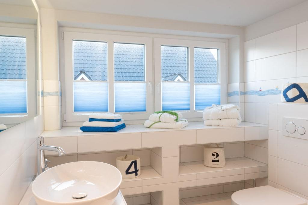 Parterre: (Eingangshalle(, Heizung), Wohnzimmer(, , TV, Kaminofen, Blu-ray-Player, Heizung, Fliegenfenster), Küche(, , Kochnische, Esstisch, Kochplatte, Wasserkocher, Toaster, Kaffeemaschine, Backofen, Mikrowelle, Spülmaschine, Kühlschrank, Tiefkühlschrank, Heizung, Hochstuhl, Fliegenfenster), Badezimmer(, Toilette, Dusche, Waschbecken, Heizung, Fliegenfenster), Abstellraum(, Trockner, Waschmaschine, Heizung, Bügelbrett, Bügeleisen, Trockenschrank)) In der 1. Etage: (Schlafzimmer(, Doppelbett, TV, Heizung, Fliegenfenster), Schlafzimmer(, , Einzelbett, Einzelbett, Heizung, Fliegenfenster), Badezimmer(, Toilette, Dusche, Waschbecken, Heizung, Wickelauflage, Föhn, Fliegenfenster)) In der 2. Etage: (Schlafzimmer(, , Bibliothek, Einzelbett, Heizung, Spielzeug, Fliegenfenster)) , , , Internet, Internet, Erste-Hilfe-Station, Trockner, Waschmaschine, Heizung, Terrasse(, Strand, Grill, Gartenmöbel), Parkplatz, Bügelbrett, Bügeleisen, Trockenschrank, Telefon