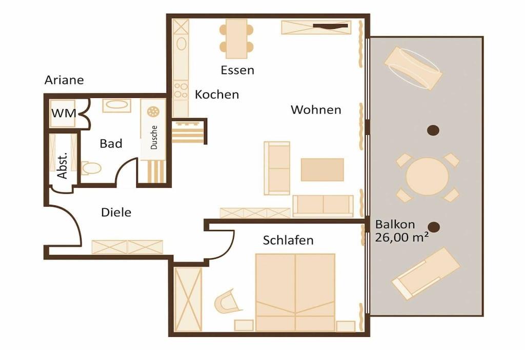 Sie wollen die Ruhe genießen und entspannen, aber auf eine zentrale Lage und Komfort nicht verzichten? Dann ist die Ariane in der Villa Friede-Marie mit seiner exklusiven Atmosphäre genau das Richtige für Sie. Moderne, behagliche Möbel, komfortabel ausgestatteter Küchenbereich, Fußboden mit ital. Fliesen, Fußbodenheizung, ein Bad mit Dusche (ebenerdiger Einstieg) und ein Schlafzimmer mit Meerblick aus dem Doppelbett unterstreichen das Besondere dieser Ferienwohnung. Ariane verfügt über einen großzügigen Balkon mit Rocking Chair, nach Süden ausgerichtet, mit grandiosen Sonnenaufgängen (zumindest von November bis Februar). Seien Sie unser Gast und genießen die Inselwelt und Ihren Urlaub in unserer Ariane – wir freuen uns auf Sie.
