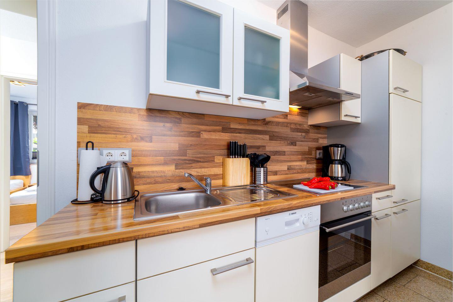 - Voll ausgestattete Küche mit Backofen, Kühlschrank, Spülmaschine u.v.m.