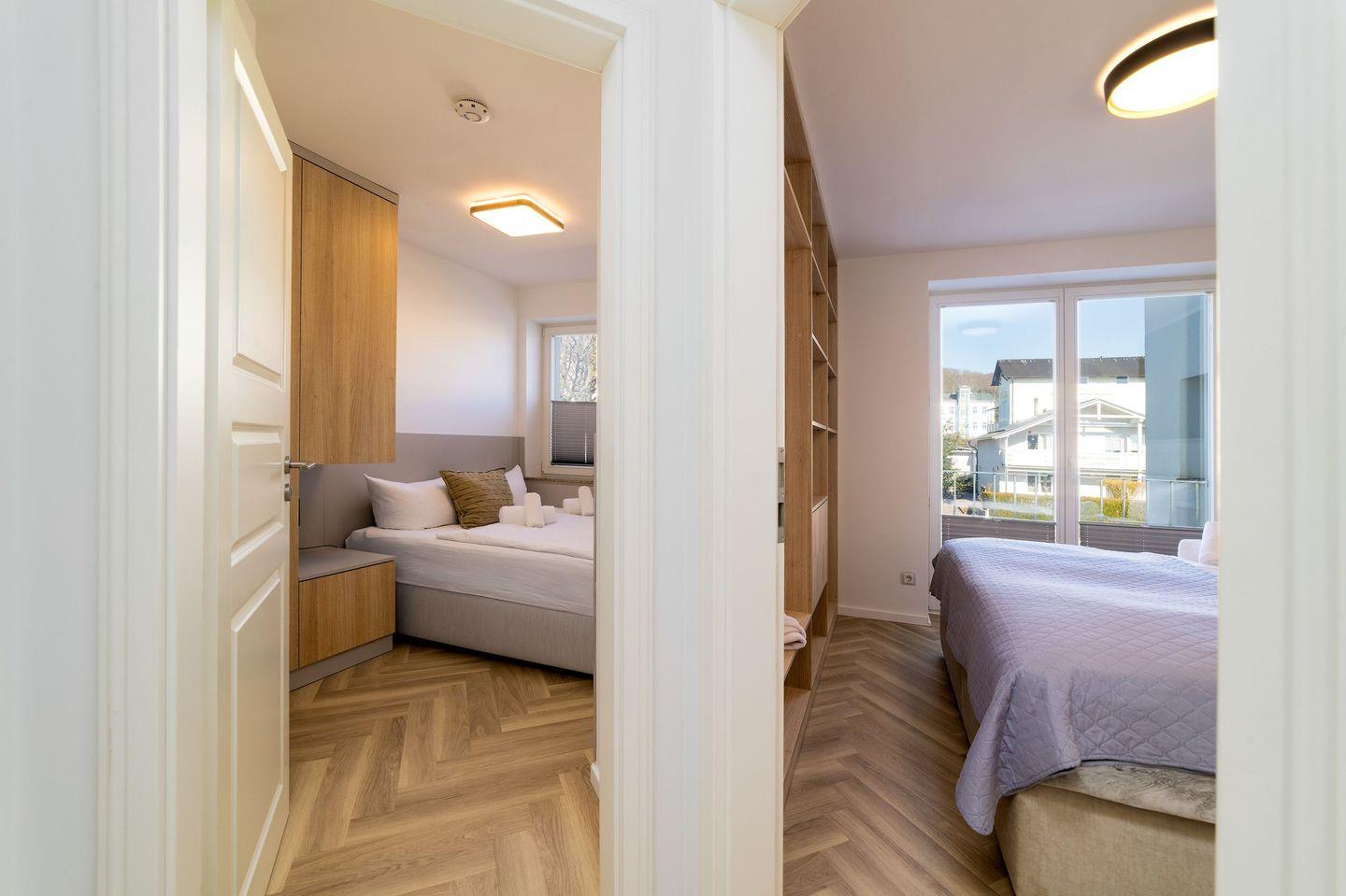 Unsere Gäste haben Zugang zur gesamten Ferienwohnung inklusive Wohnzimmer, zwei Schlafzimmern mit Balkon und Meerblick, dem großzügigen Badezimmer mit Dusche und Badewanne sowie einem separaten WC im Saunabereich.