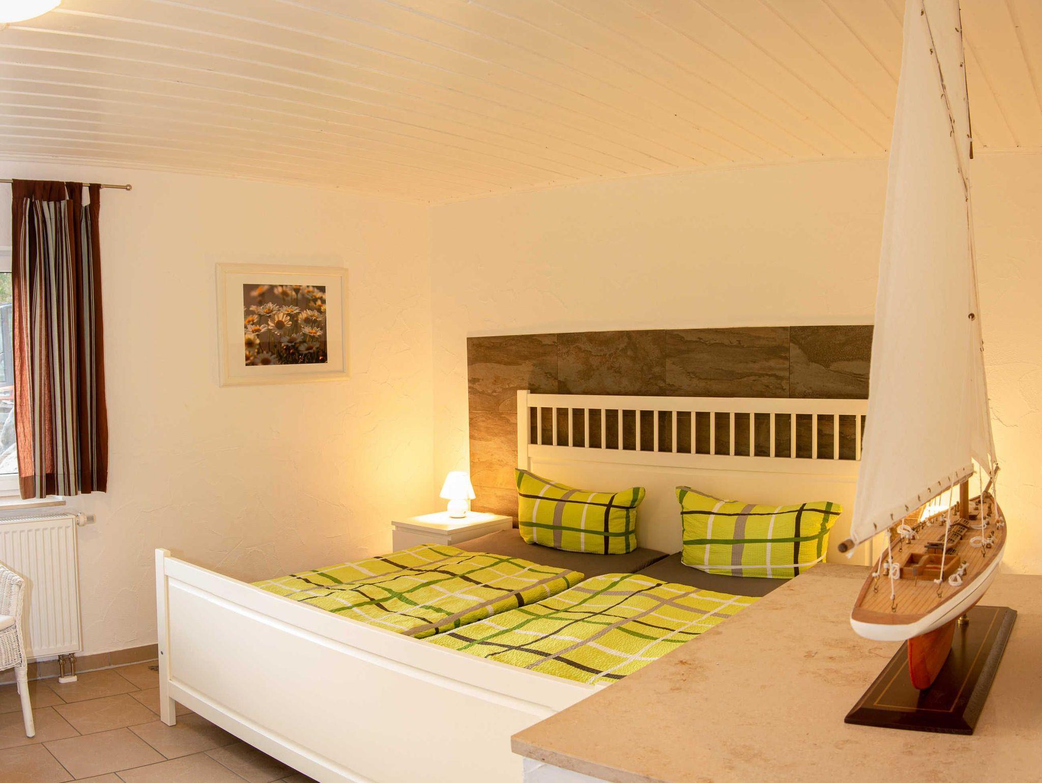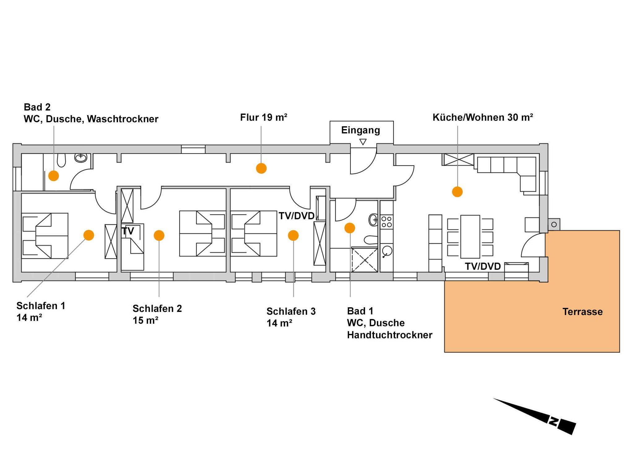 Auf über 100 qm barrierefreier Wohnfläche befinden sich 3 helle Schlafzimmer jeweils mit Doppelbett (1,80 m x 2,00 m) und 1x mit zusätzlichem Einzelbett, 2 Bäder und 1 Wohnzimmer mit offener Küche. Die ca.30 qm große, teilweise überdachte Süd-West-Terrasse lädt zum Grillen ein.