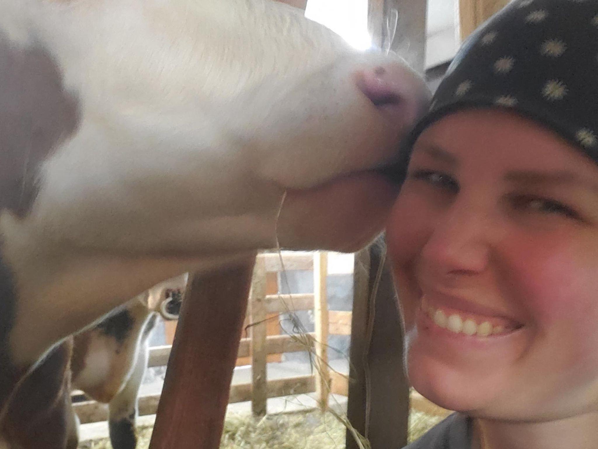 Mit uns leben hier: 11 Milchkühe und deren Nachzucht - auch die Stierkälber, damit sie nicht ins Ausland transportiert werden müssen - (Fleckvieh, Braunvieh und die vom aussterben bedrohte und hier heimische Rasse Murnau Werdenfelser), Esel, Ziegen, Hühner, Gockel und unser Kater Alfons.