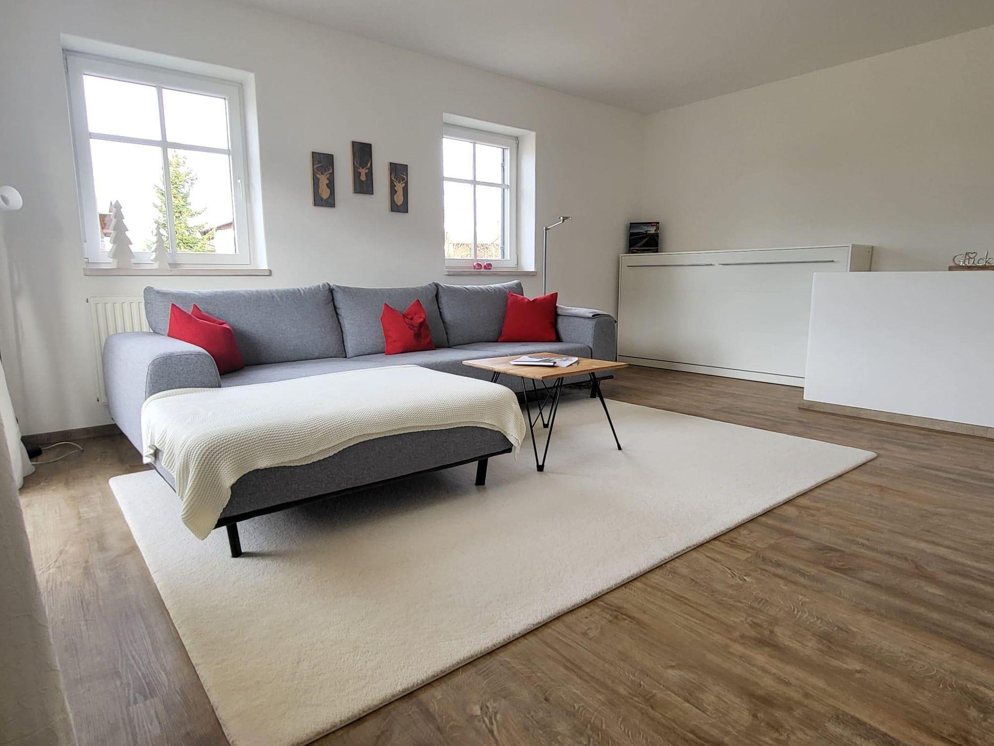 Ihre Ferienwohnung Naturzeit bietet Ihnen zwei getrennte Schlafzimmer für erholsamen Schlaf. Ein Schlafzimmer verfügt über ein Kingsizebett 180x200m und das 2. Schlafzimmer über ein Queensizebett 160x200m. Der 5. Gast kann es sich im großen Wohnzimmer im Obergeschoß gemütlich machen. Hier befindet sich ein vollwertiges Schrankbett 80x200m.