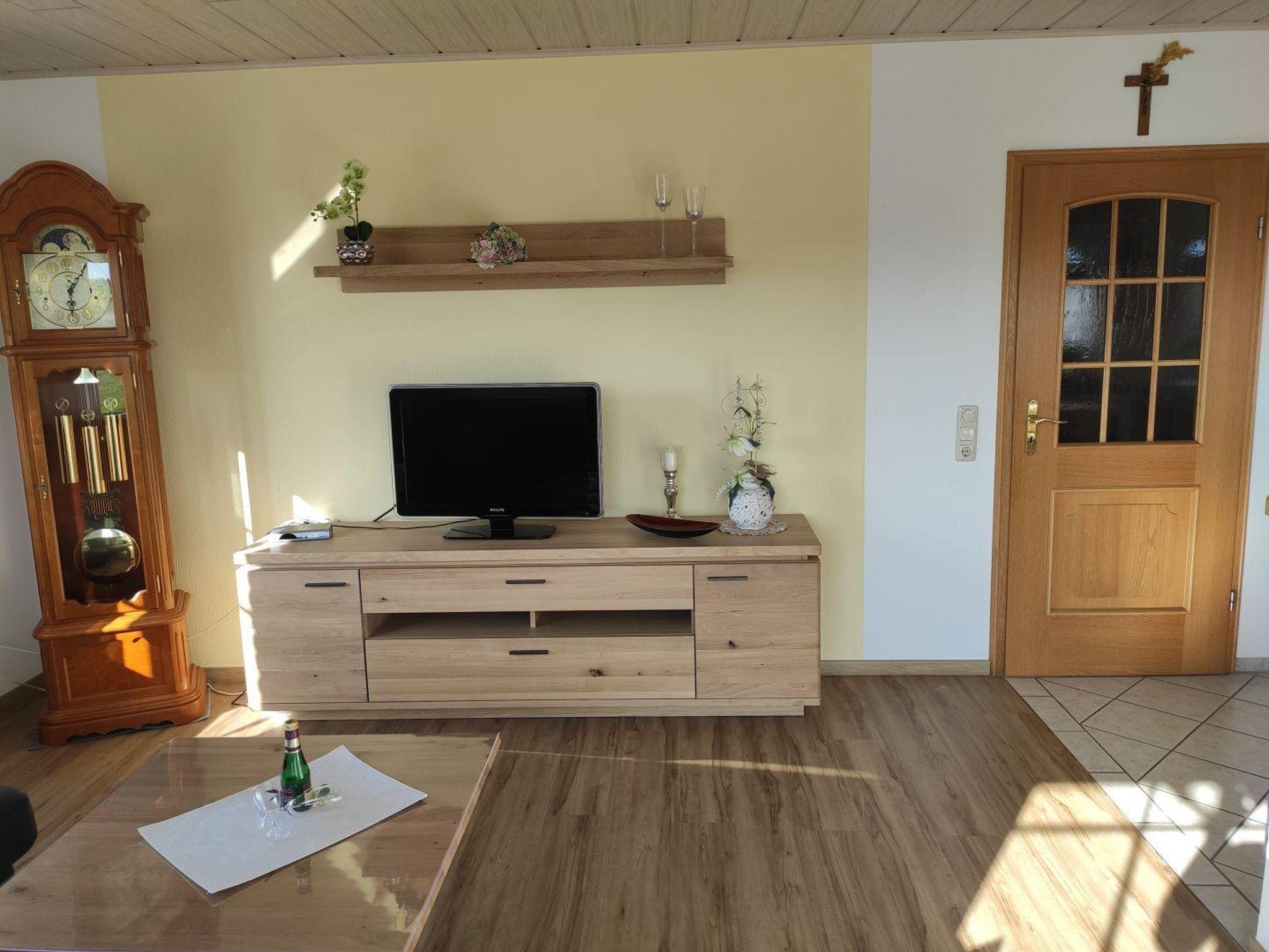 Das Wohnzimmer ist eingerichtet mit einer Ledercouch, höhenverstellbarem Couchtisch, Fernseher, Radio mit ( DAB+,CD)und einem Sorglosinternet .