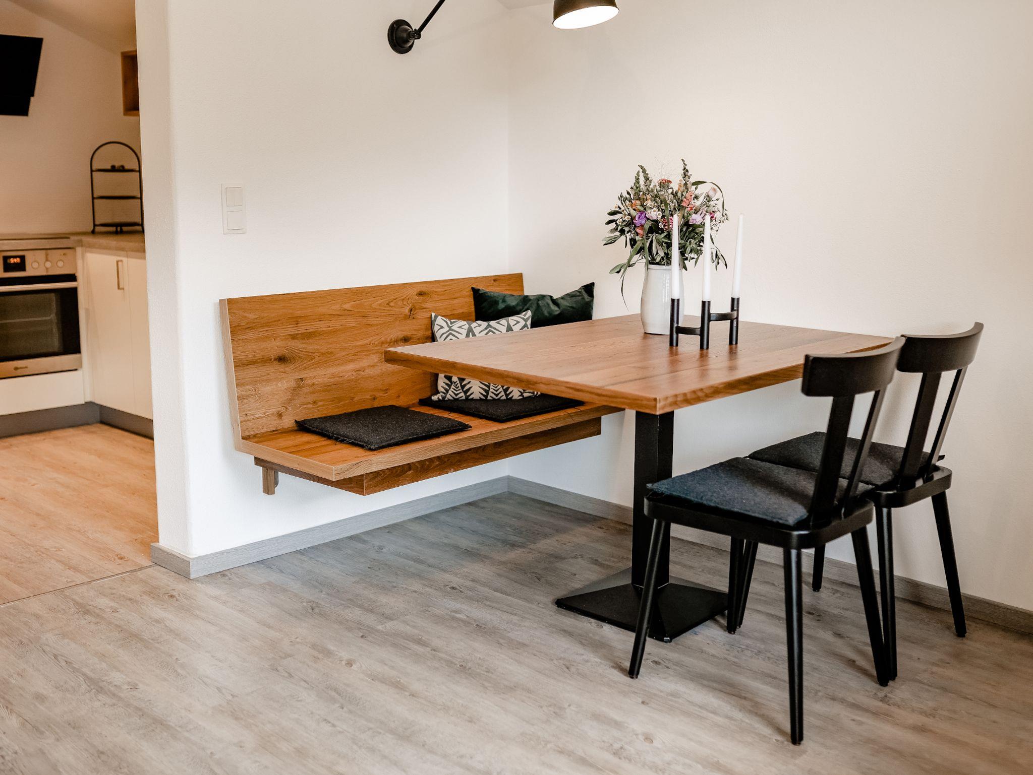 Die Ferienwohnung Watzmann mit ca. 70 qm liegt im Dachgeschoss. Sie bietet Platz für bis zu vier Personen. Ein Schlafzimmer mit Dusche / WC / TV, gemütlichem Wohn- Essbereich mit TV, offener Küche und Balkon.Eine separate Suite für zwei Personen ist zu buchbar.