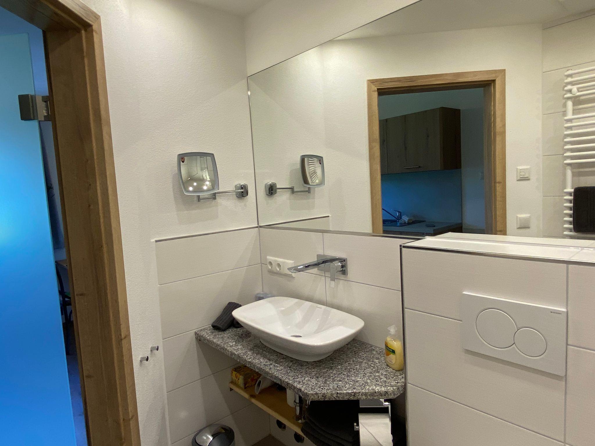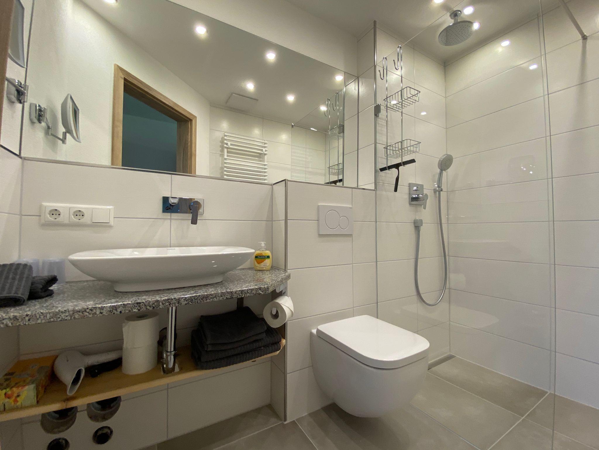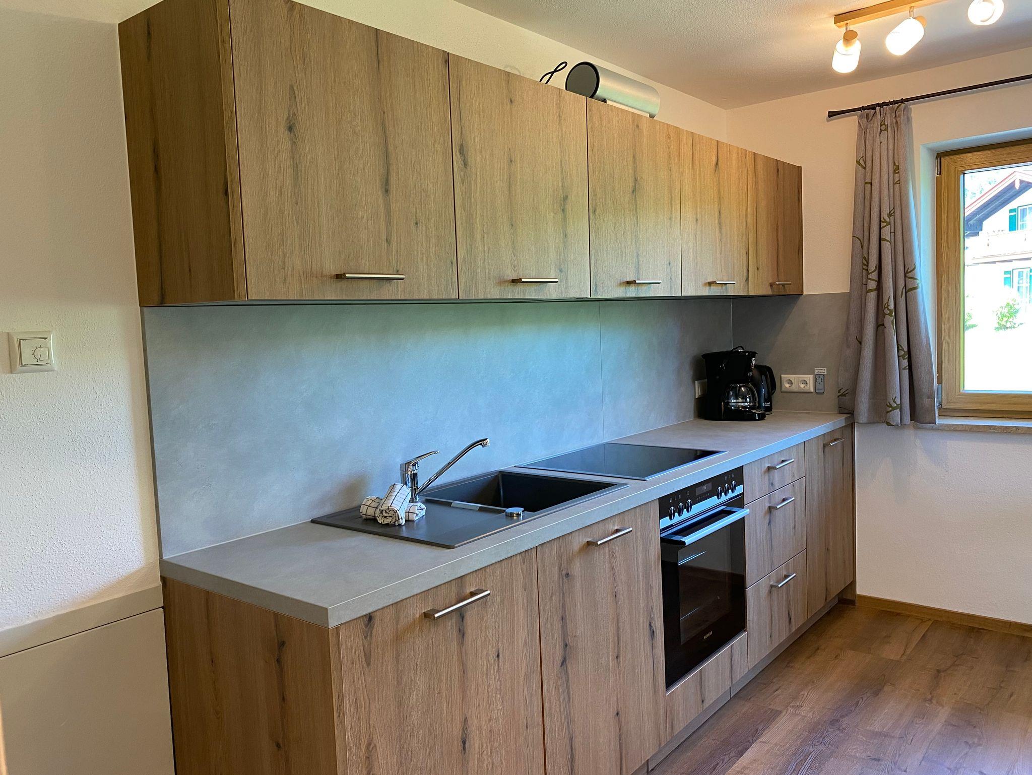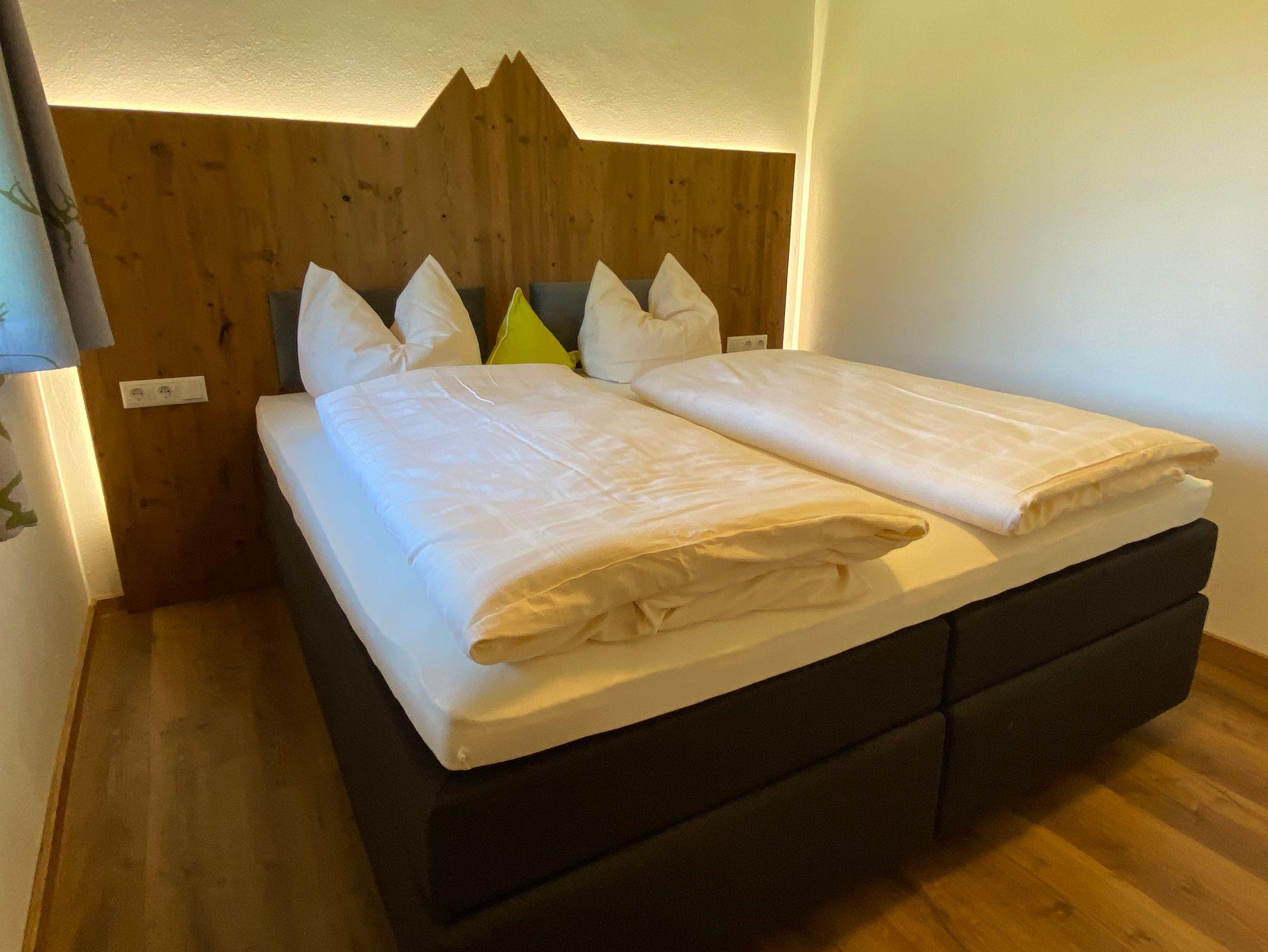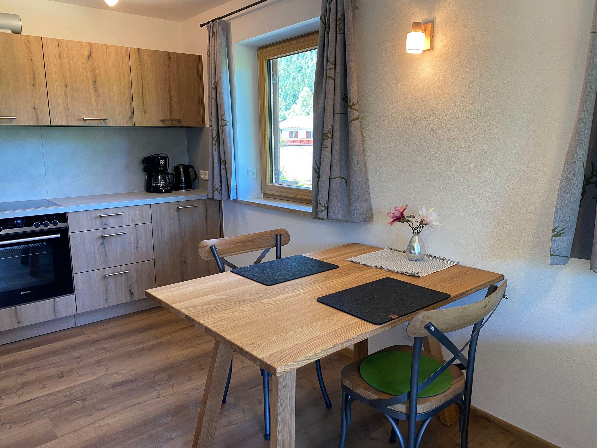 Unsere neu errichtete, ruhig gelegene und sehr hochwertig ausgestattete Ferienwohnung besitzt eine voll eingerichtete Wohnküche mit Kühlschrank, Tiefkühlfach, Glaskeramikkochfeld, Backofen, Spülmaschine, Kaffeemaschine, Wasserkocher und Toaster. Die Essecke und das Sofa sowie der Flachbildschirm mit Kabel-TV laden zum Verweilen ein. Das Badezimmer verfügt über eine ebenerdige Dusche mit Regenbrause, WC, großem Spiegel und beleuchteten Kosmetikspiegel. Das Schlafzimmer mit Boxspringbett, Aufbewahrungsmöglichkeiten und ein Flachbildschirm mit Kabel-TV sorgen für einen erholsamen Aufenthalt. Die komplette Wohnung verfügt über eine Fußbodenheizung, regulierbar in jedem Raum. Vom möblierten Nordbalkon genießen Sie den Blick auf das traumhafte Bergpanorama. Freies W-Lan im ganzen Haus.