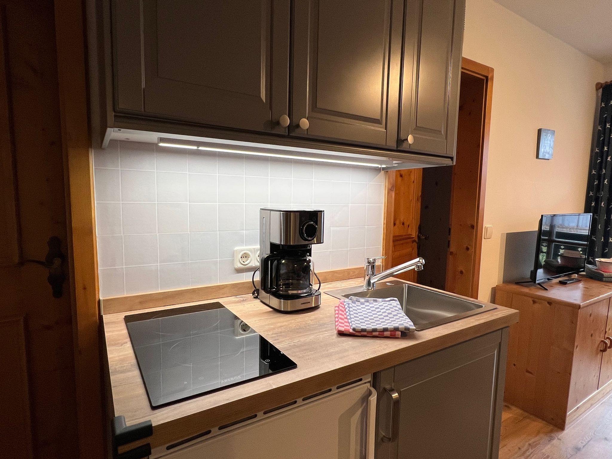 Die kompakte Küchenzeile ist mit der notwendigen Ausstattung zur Zubereitung kleiner Mahlzeiten ausgestattet.