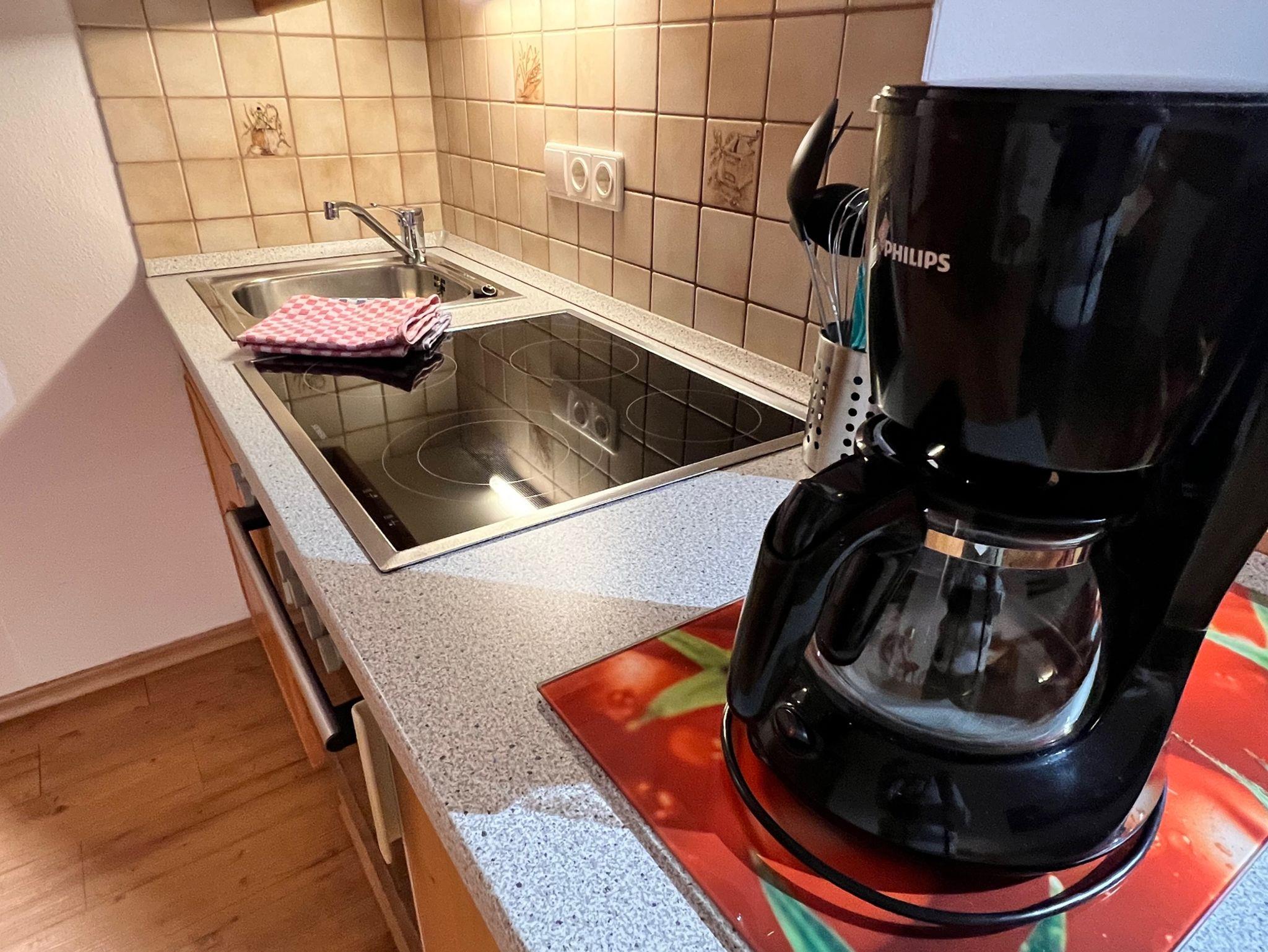 Die großzügige Küchenzeile ist mit Backofen sowie allen notwendigen Kochutensilien ausgestattet und ermöglicht eine flexible Selbstversorgung.