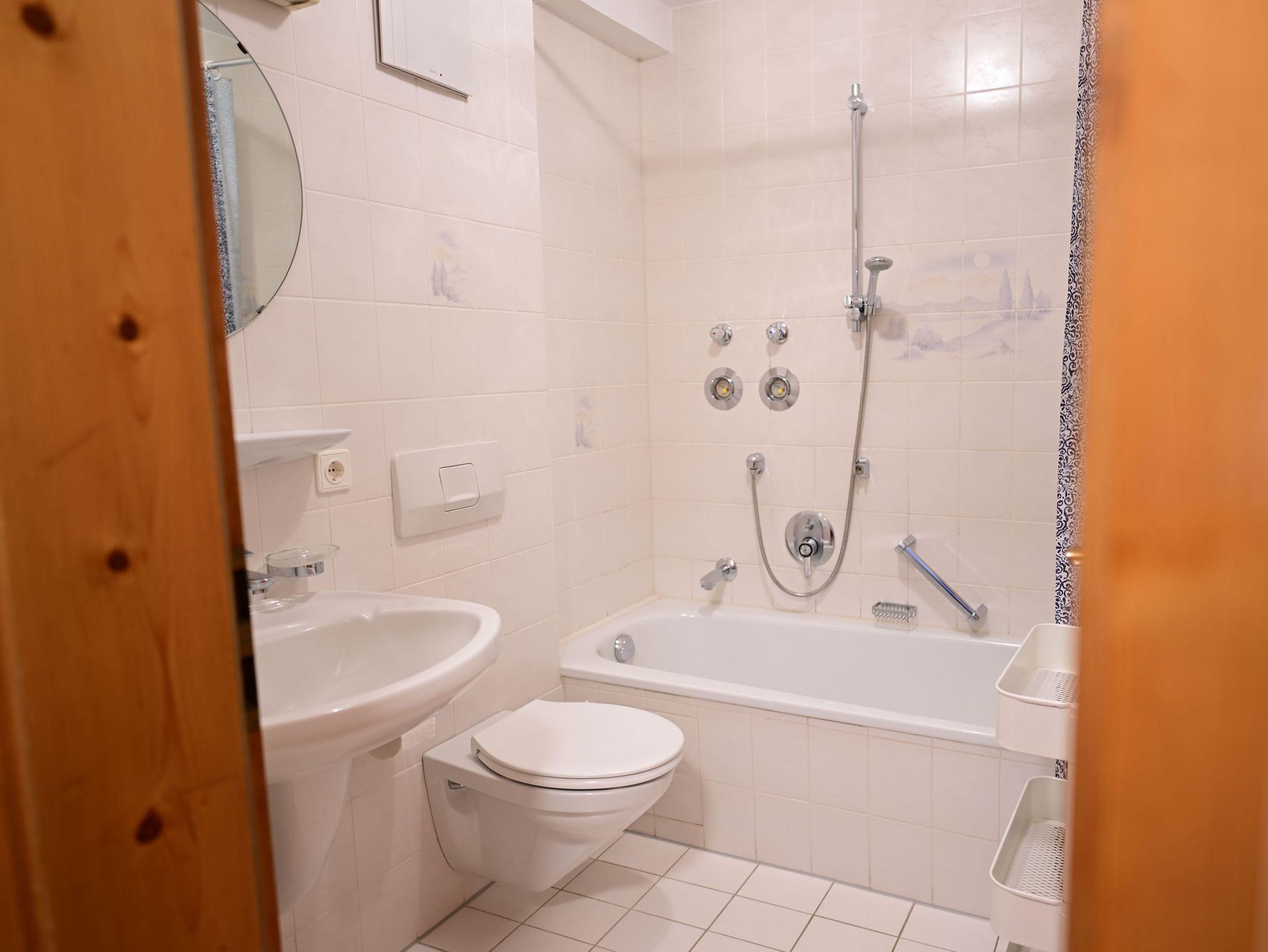 Das Badezimmer verfügt über eine Badewanne, Waschbecken und WC.