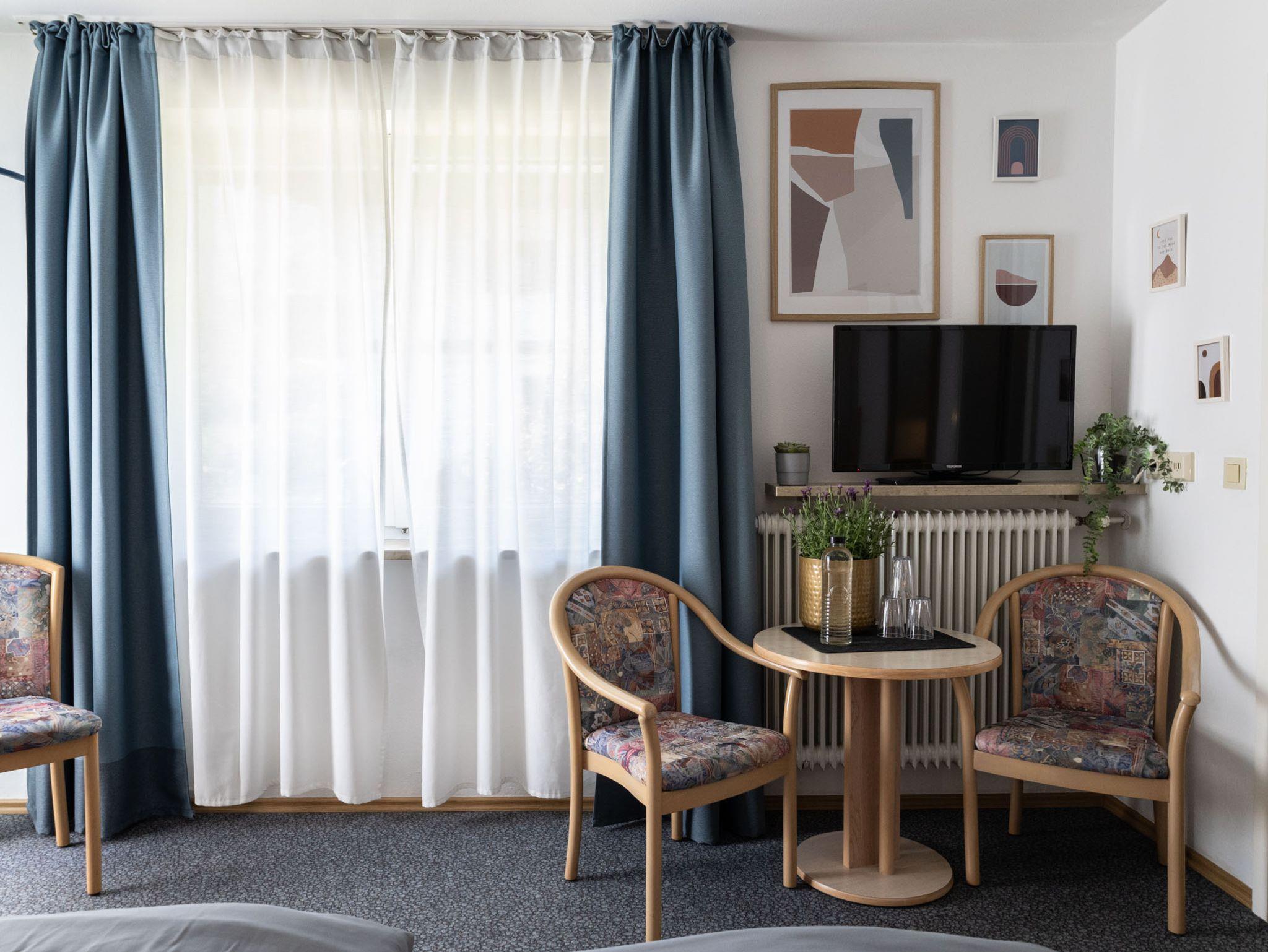 Es ist ausgestattet mit einem Doppelbett 180/200 und einem zusätzlichen Schlafsofa 90/200, einer kleinen Sitzgruppe, TV, WLAN und einem abschließbaren Nachtkästchen.