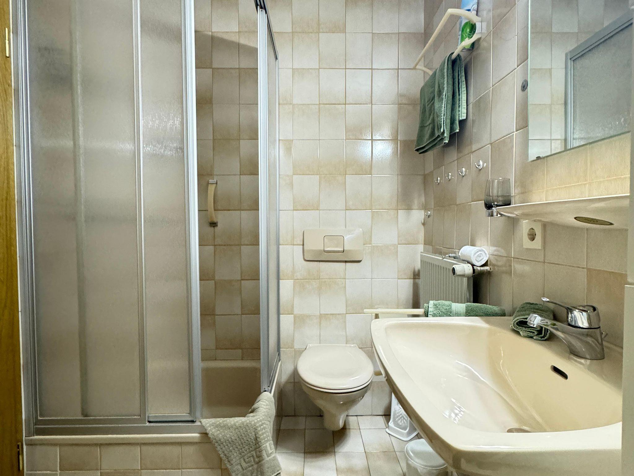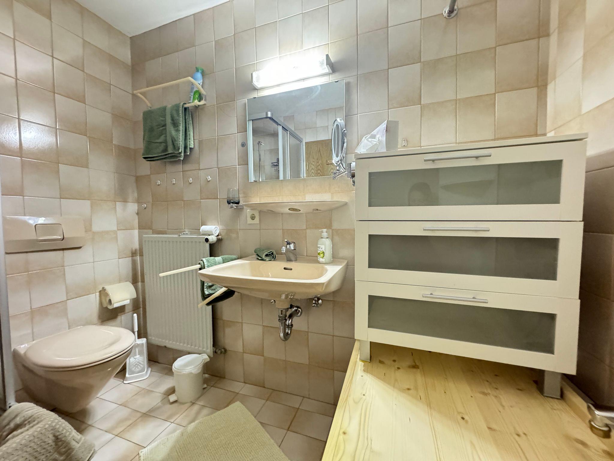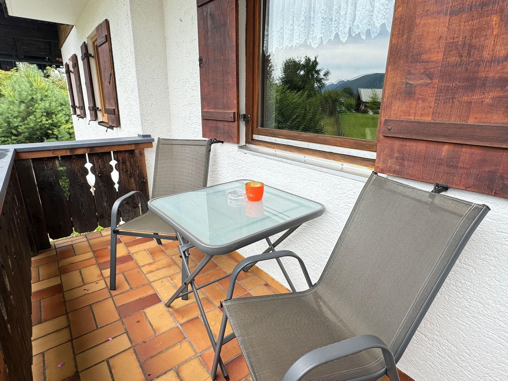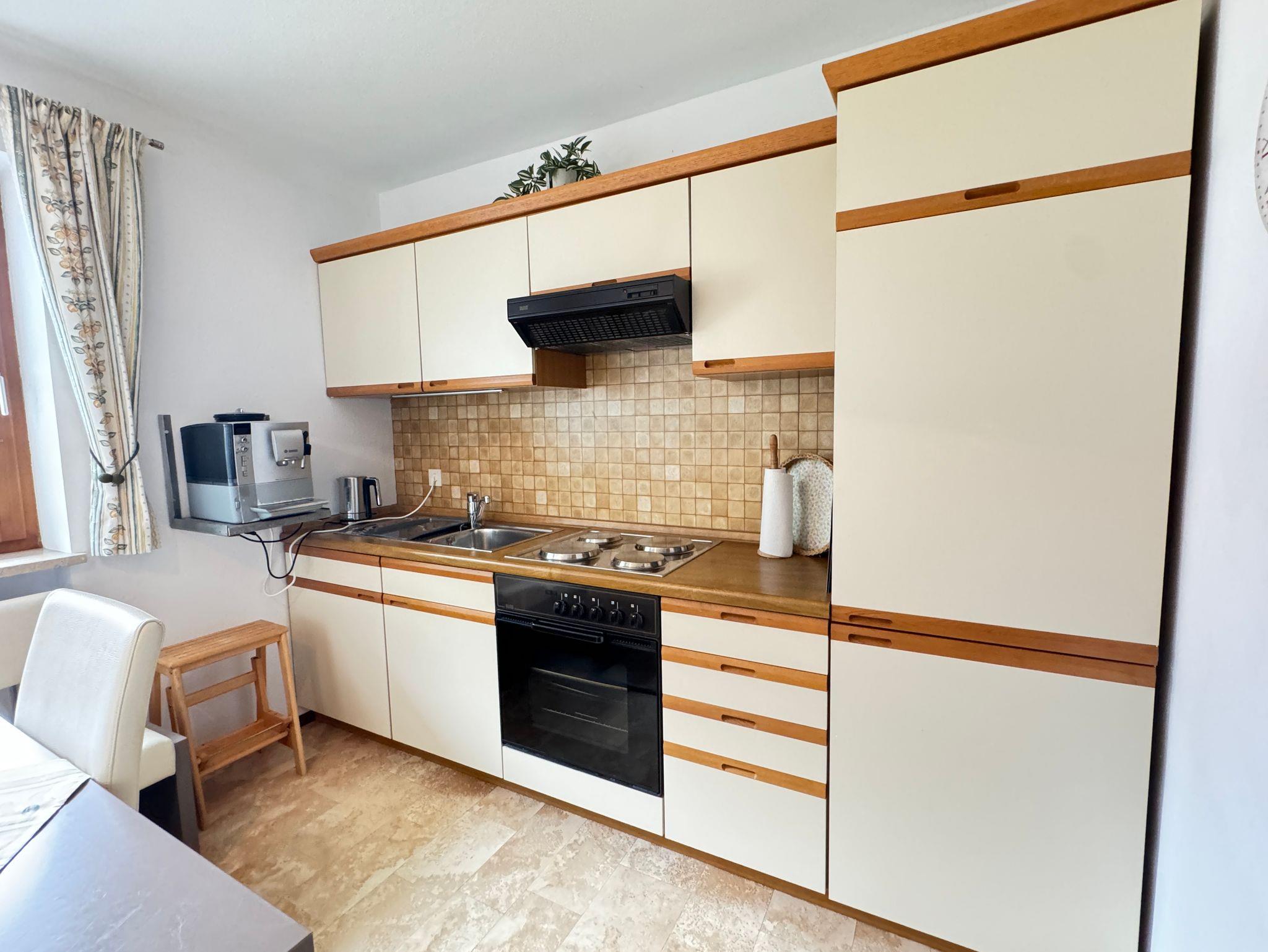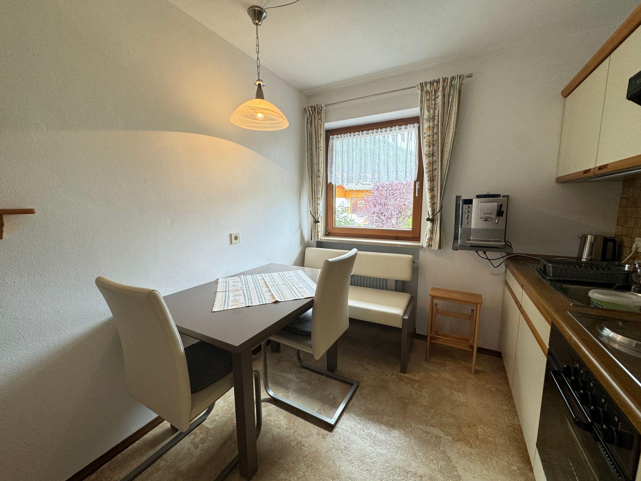 Unsere ruhig gelegene und gut ausgestattete Ferienwohnung besitzt eine Küche mit Kühlschrank, Tiefkühlfach, Kochfeld, Backofen, Kaffeevollautomat, Wasserkocher und Toaster. Die Essecke und das Sofa sowie der Flachbildschirm mit Kabel-TV laden zum Verweilen ein. Das Badezimmer verfügt über eine Dusche, WC, Spiegel. Das Schlafzimmer mit Boxspringbett und Aufbewahrungsmöglichkeiten sorgen für einen erholsamen Aufenthalt. Vom möblierten Balkon genießen Sie den Blick auf das traumhafte Bergpanorama. Freies W-Lan im ganzen Haus.