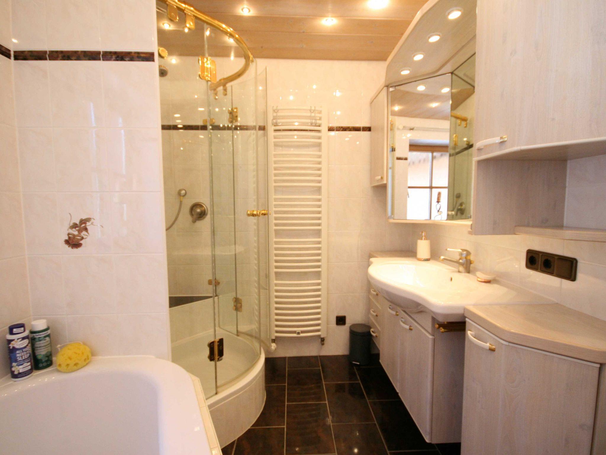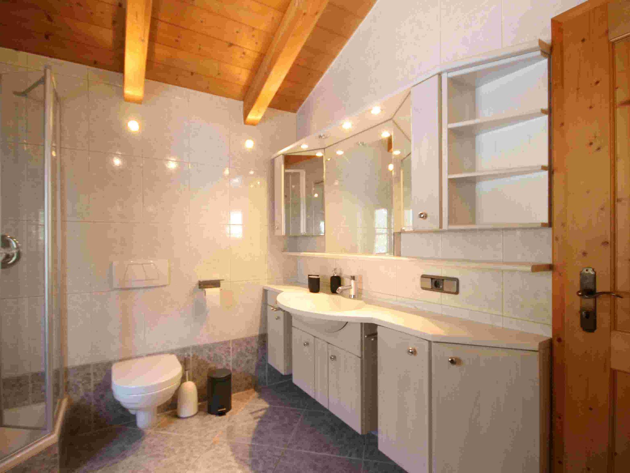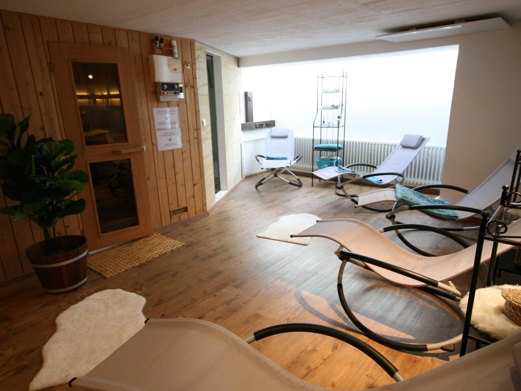 Die Alpenoase verfügt über einen großzügigen Sauna- und Ruhebereich mit Schwalldusche und Tageslichtfenster.