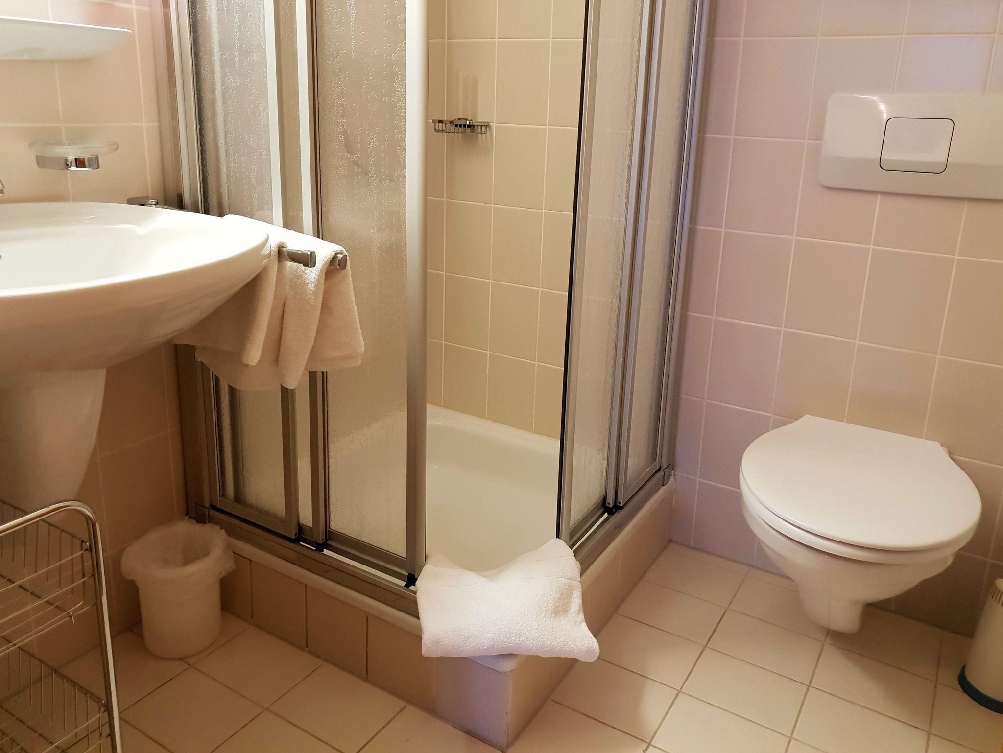 Das Badezimmer verfügt über Dusche, Waschbecken und WC.