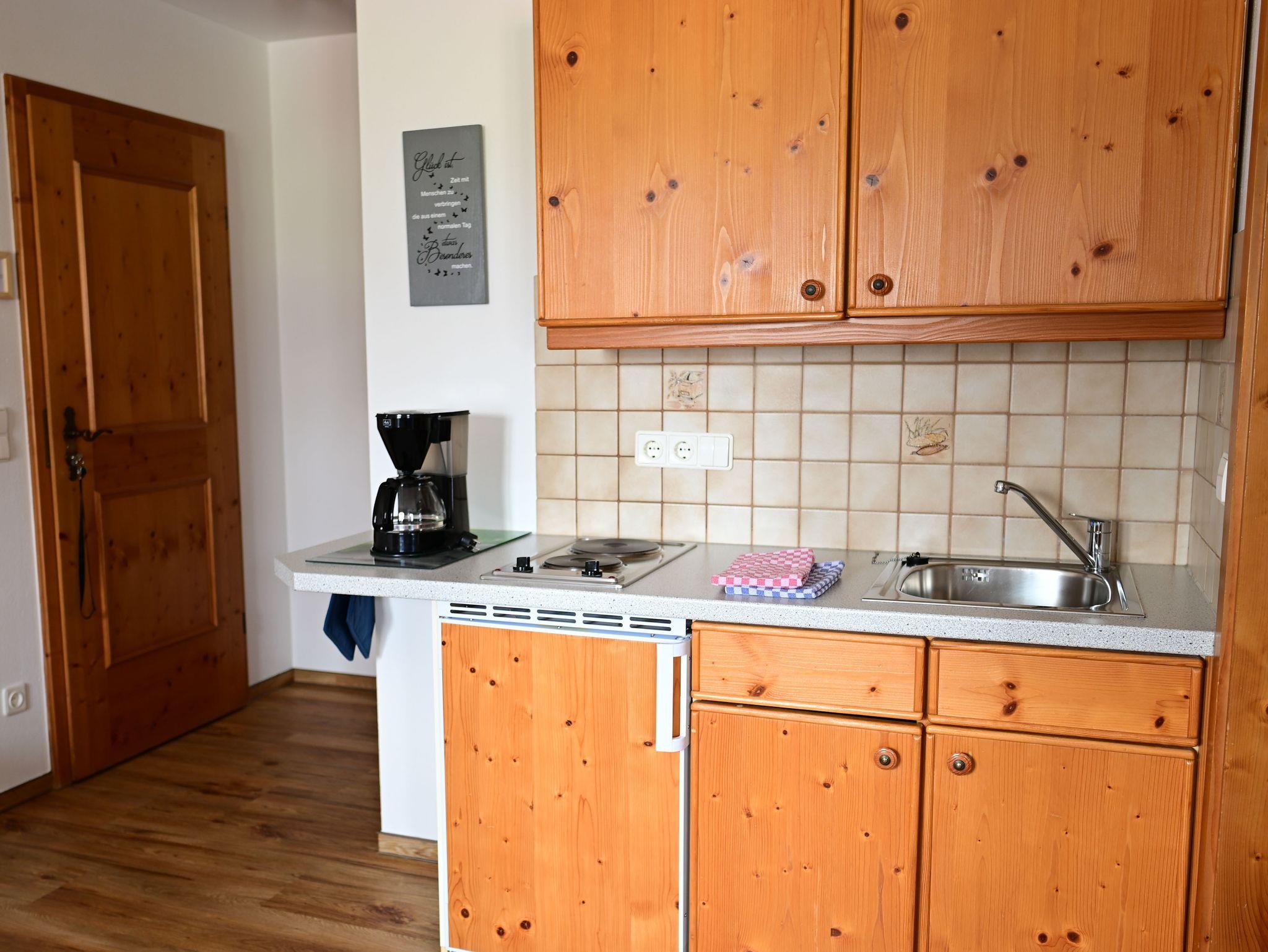 Die kompakte Küchenzeile verfügt über die notwendige Ausstattung zur Zubereitung kleiner Mahlzeiten.