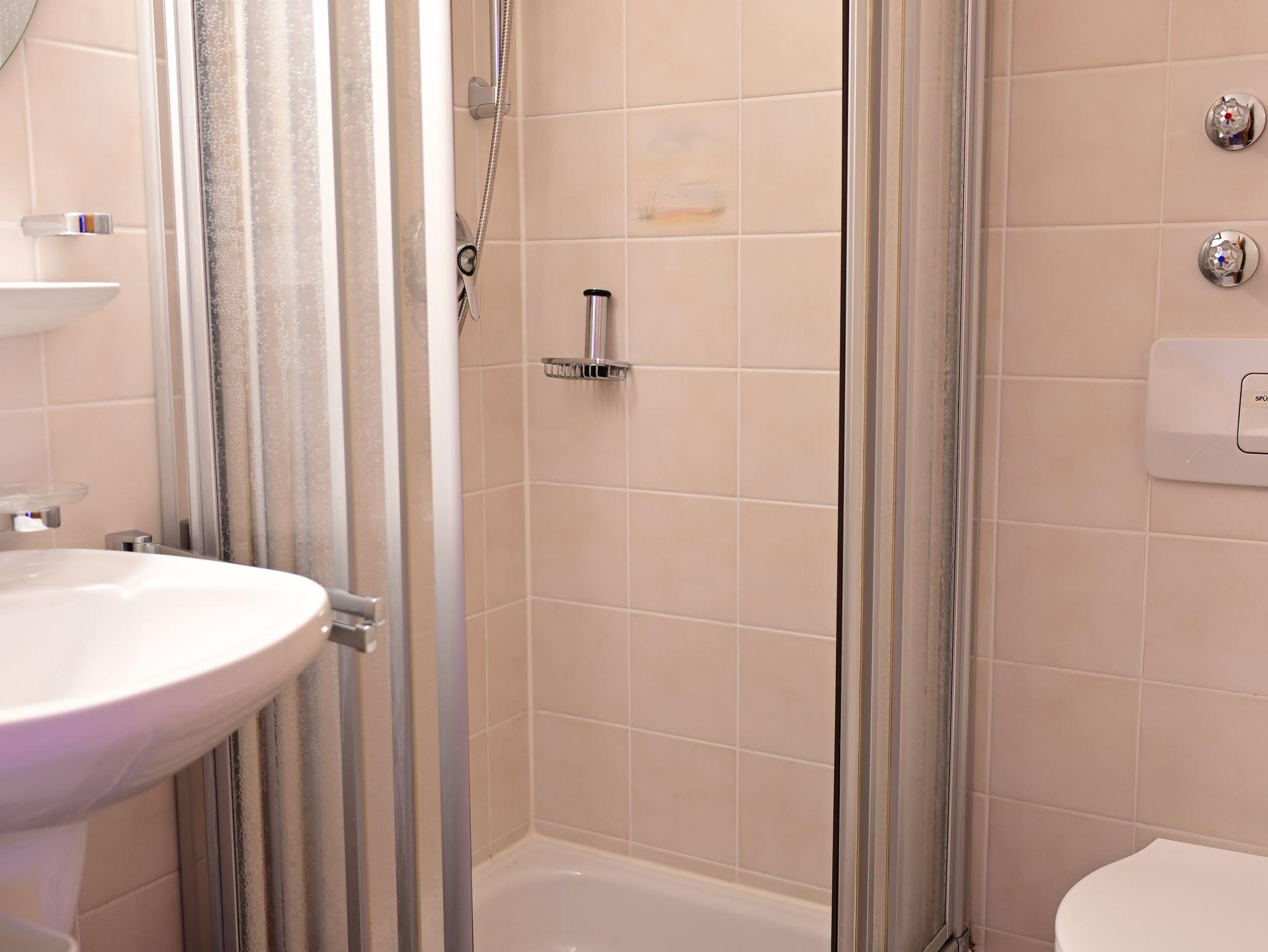 Das Badezimmer ist mit Dusche, Waschbecken und WC ausgestattet.