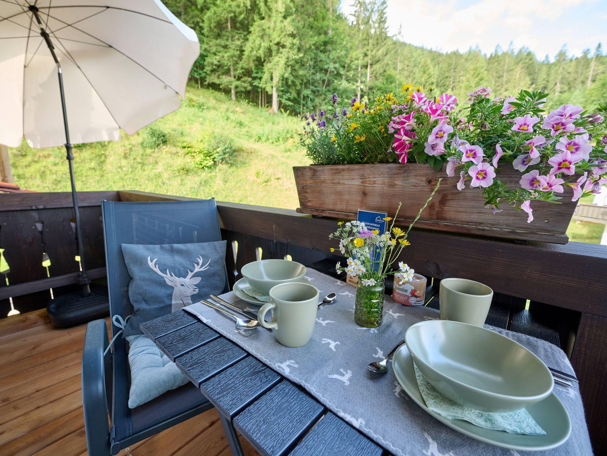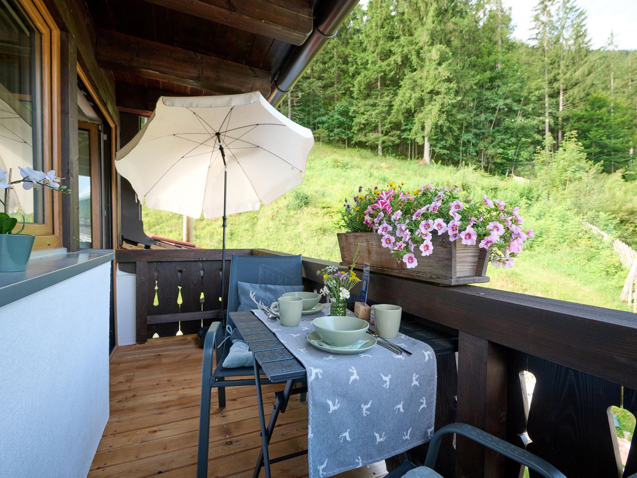Der sonnige Balkon mit Blick in die Natur lädt ein, den Urlaub mit einem Frühstück zu beginnen oder den Tag bei einem Glas Wein ausklingen zu lassen.