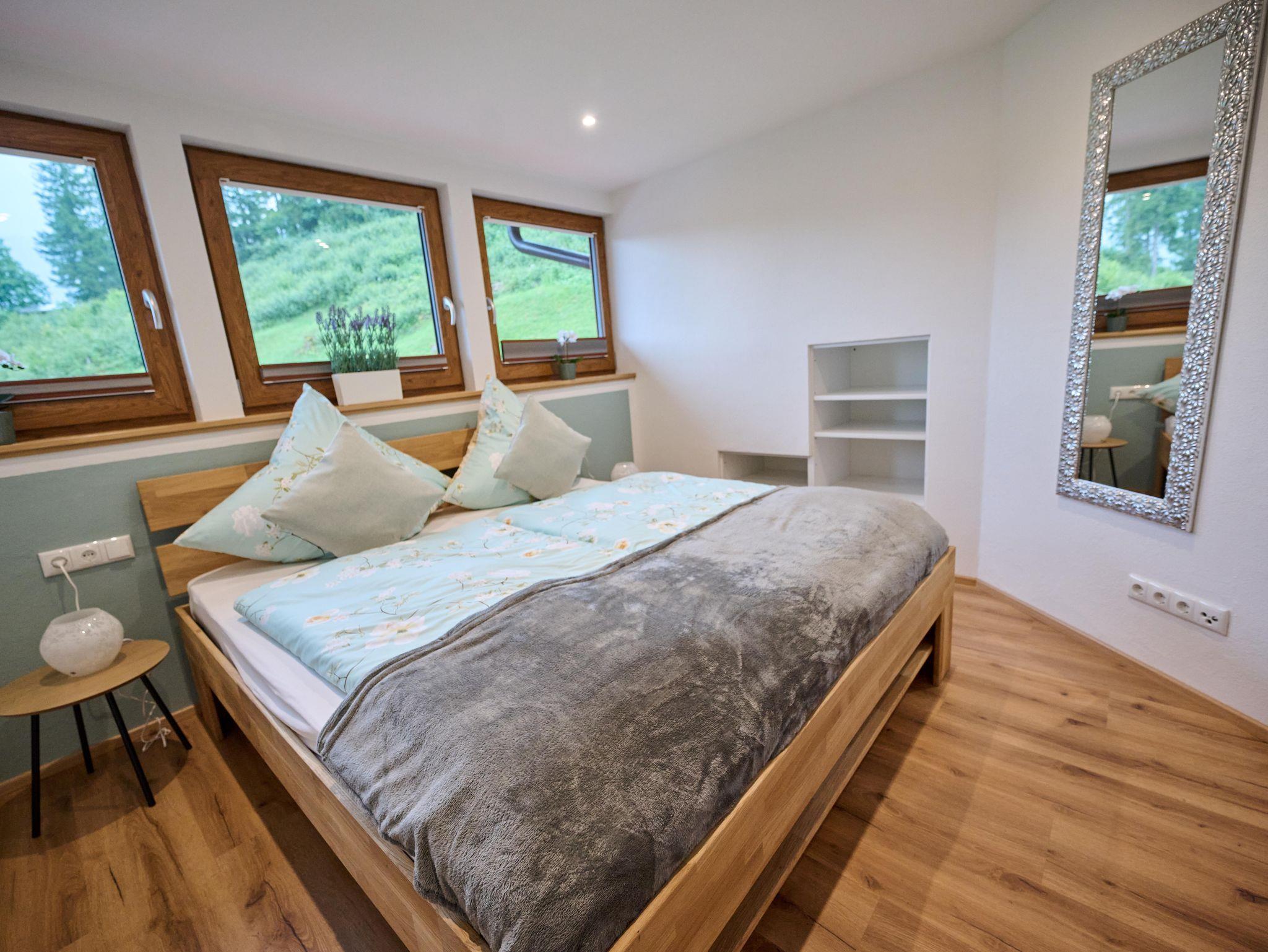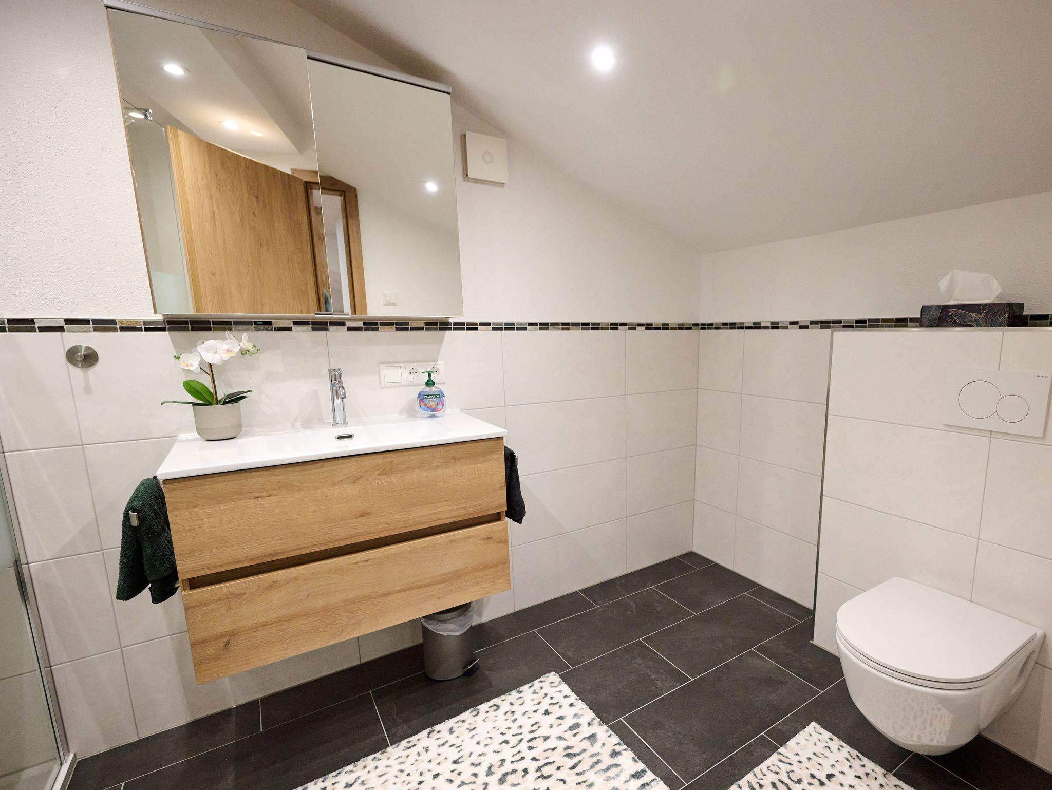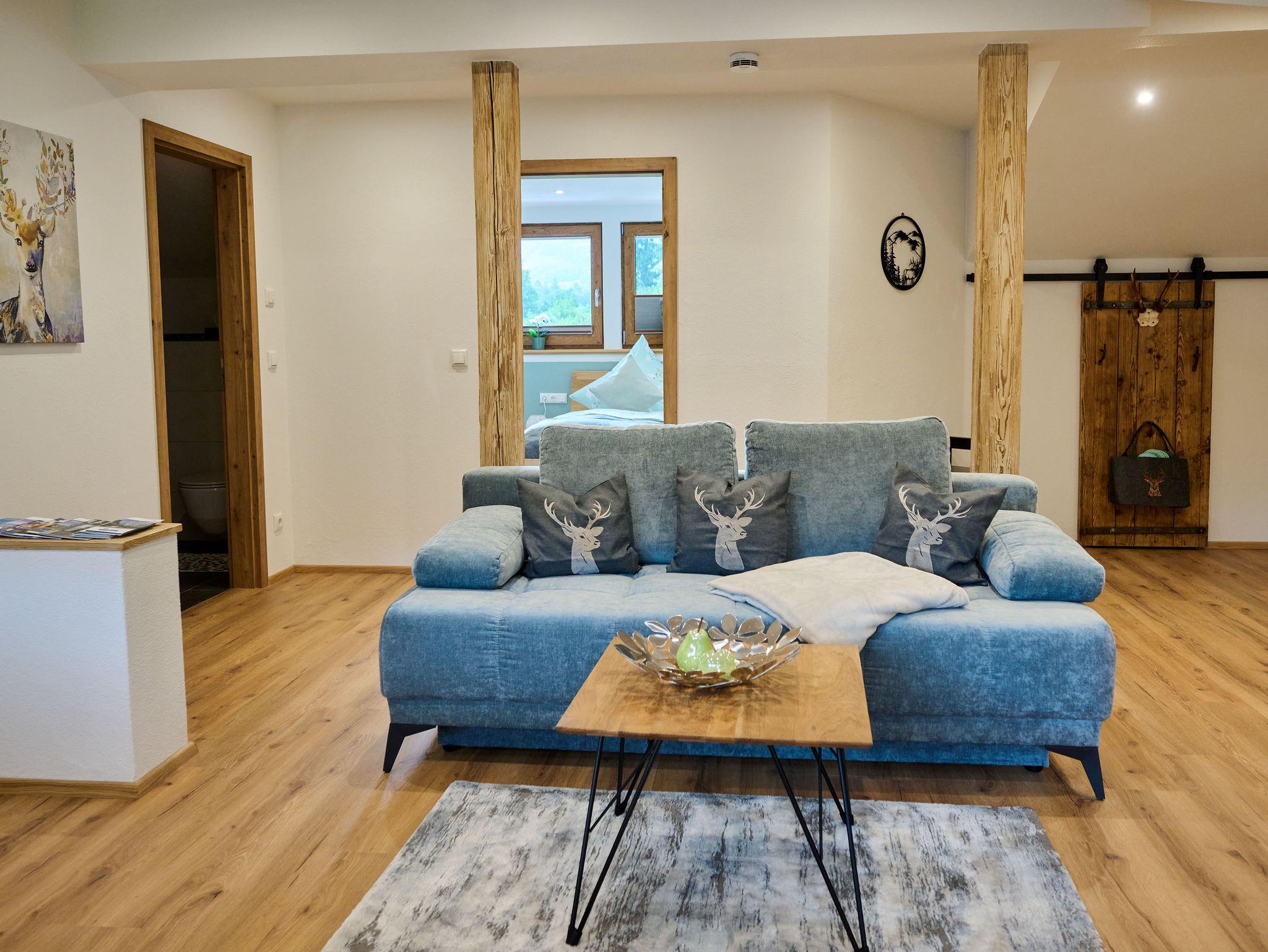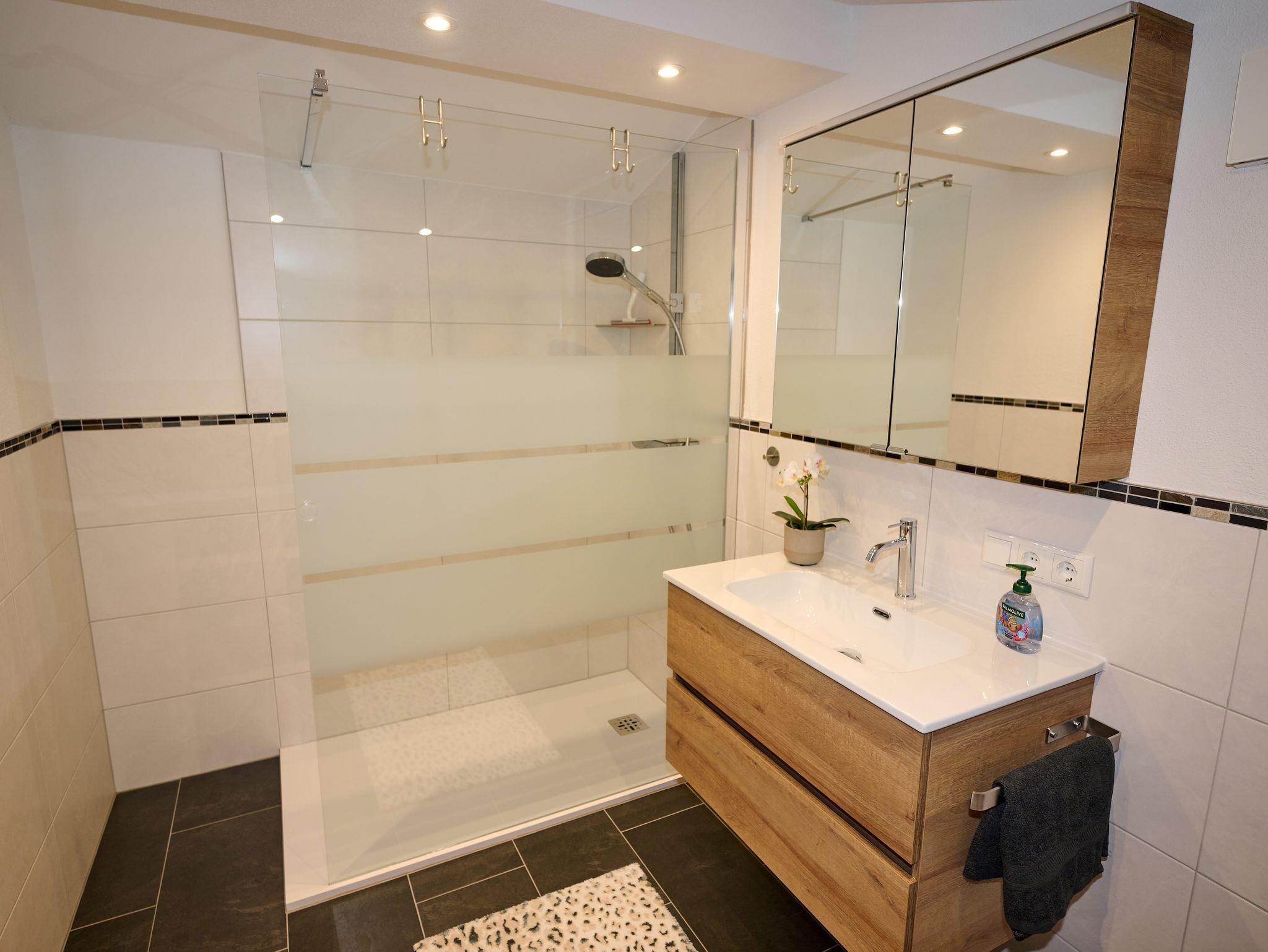 Mit Liebe zum Detail eingerichtet, erwartet Sie unsere neu gestaltete gemütliche Ferienwohung auf 50qm, zum Erholen und Entspannen. Für die schönsten Tage im Jahr steht Ihnen unsere Ferienwohnung mit zeitgemäßer Ausstattung zur Verfügung. Auszeit geniessen im gemütlichem Wohn-und Essbereich, Kochen in der komplett ausgestatteten Küche mit Ceranfeld, Backofen, Mikrowelle, Spülmaschine und Kaffeemaschine. Wohlfühlen im sonnendurchfluteten Wohnbereich mit gemütlichen Sofa und Flachbildschirm. In einer Nische befindet sich ein extra Bett, das gerne von Kindern als Kuschelhöhle genutzt wird. Badezimmer mit ebenerdiger Walk-In-Dusche/WC, Badeaccesoire ,Bade/ Handtücher, Fön, Handtuchhalter. Das Schlafzimmer mit Blick in der Wald ist mit einem Doppelbett mit Topper, Bettwäsche und verstellbaren Lattenrosten ausgestattet.