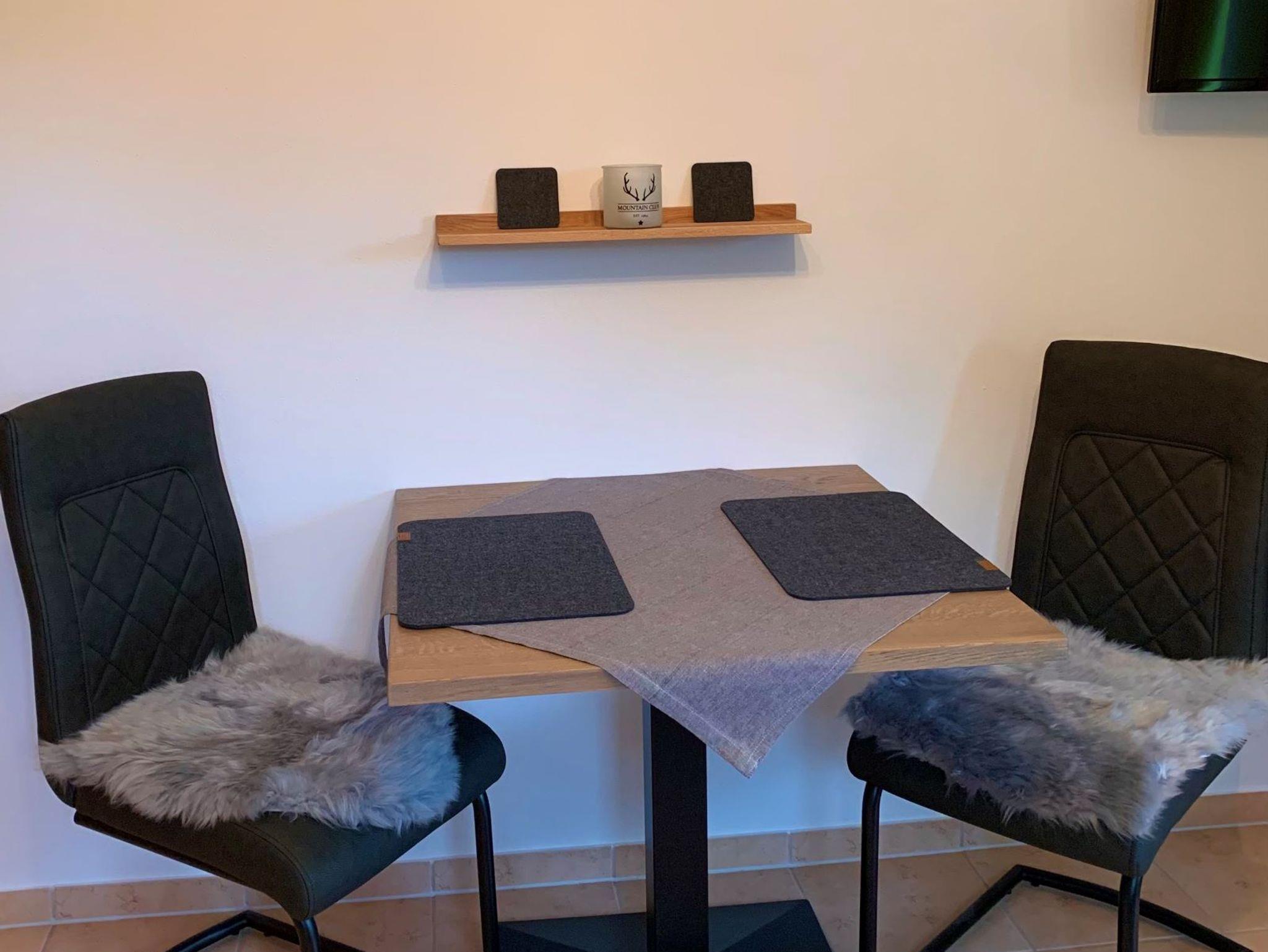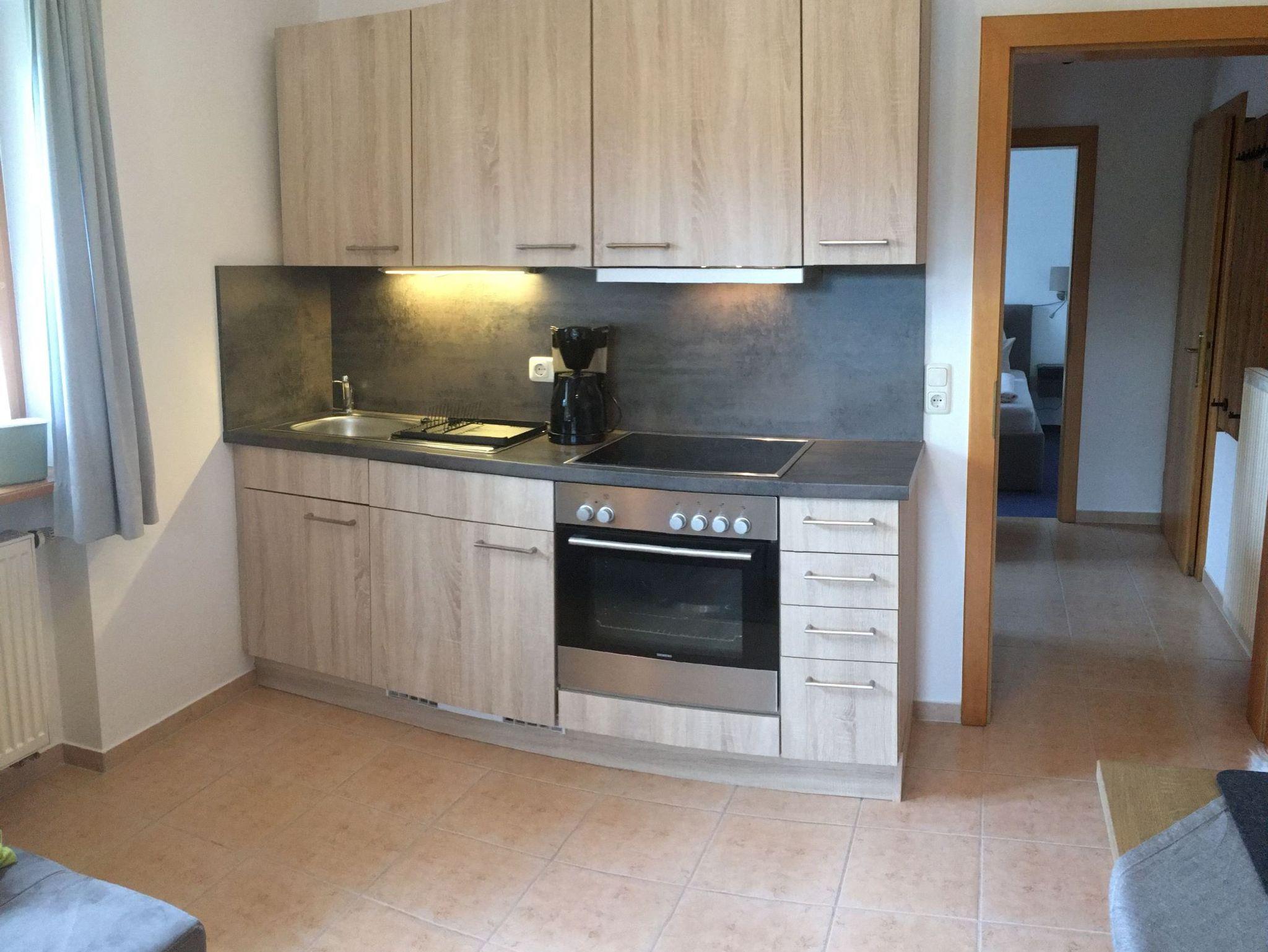 Ferienwohnung für 1-2 Erwachsene (35 qm), Balkon mit Bergblick, Schlafzimmer, Dusche/WC, Wohnzimmer mit Küchenzeile, Essplatz und Sofa, Internet-TV, WLAN, Radio, 4er Ceranfeld, Dunstabzug, Backofen, Kühlschrank, Kaffeemaschine, Toaster, Wasserkocher, Eierkocher. Eigener Eingang, Kfz-Stellplatz.