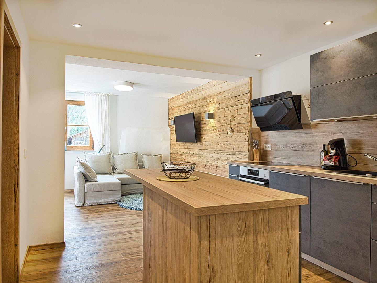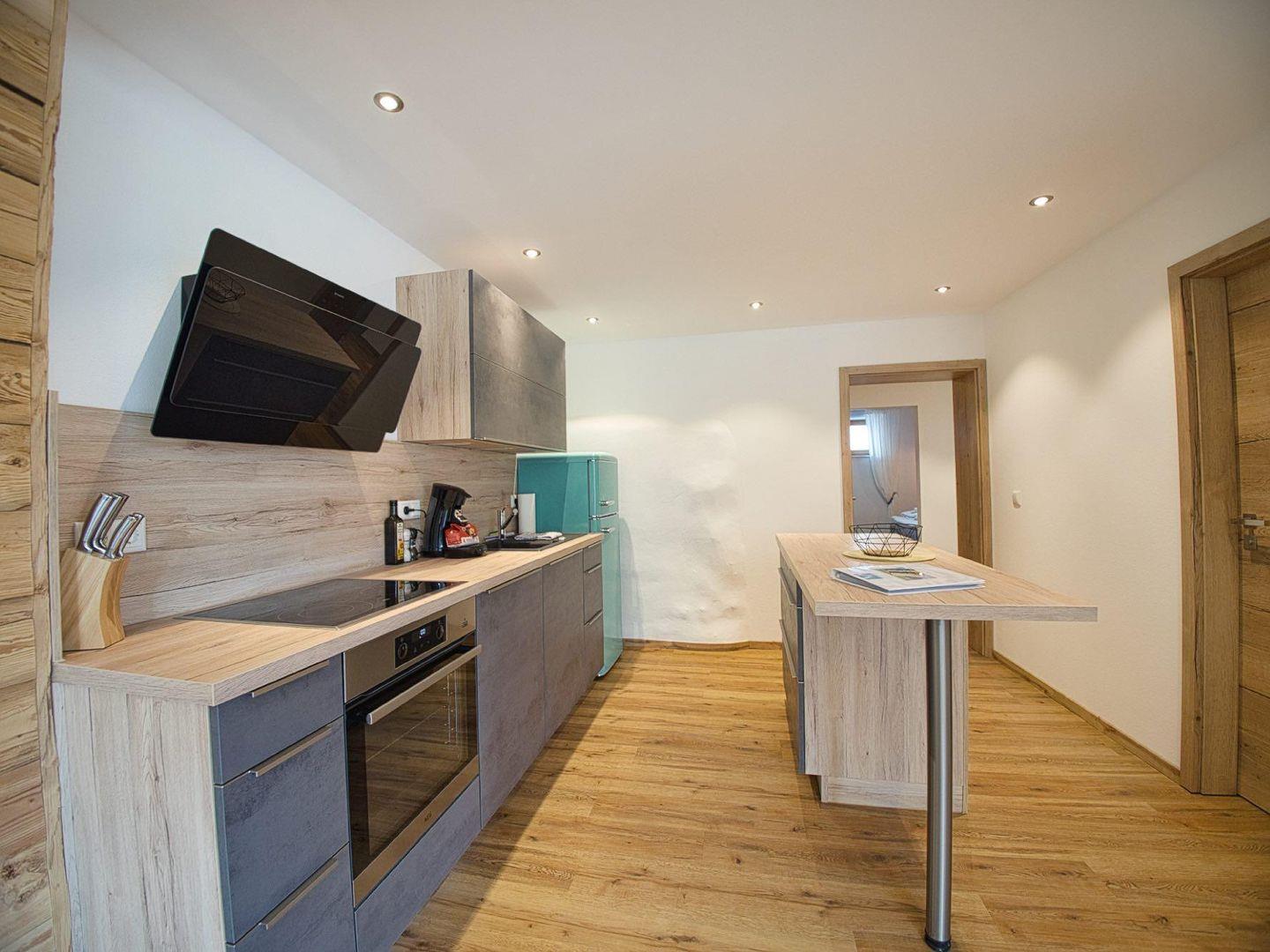 Die moderne Küche mit Kochinsel ist vollständig ausgestattet und ideal für entspannte Kochabende zu zweit oder mit der Familie. Alles ist offen, hell und funktional – unkompliziert und hochwertig zugleich.