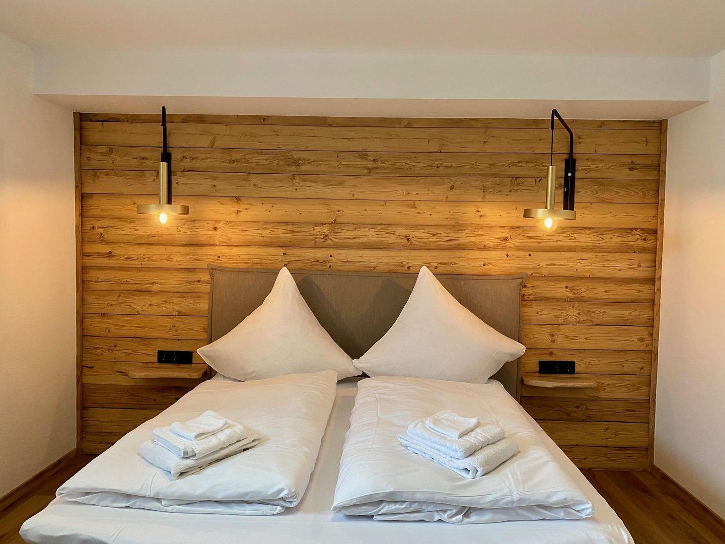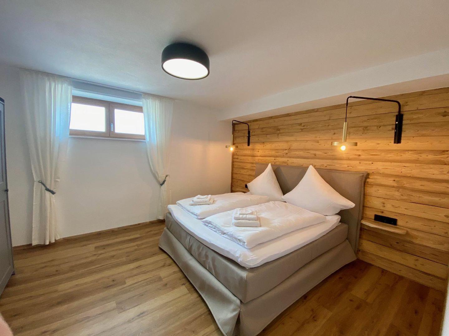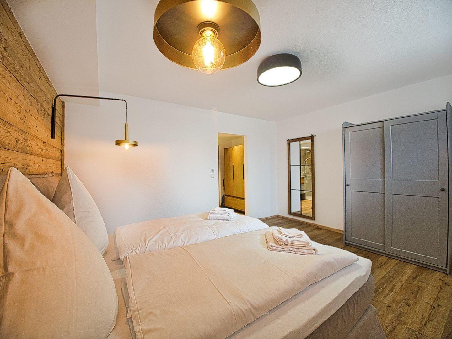 Im Schlafzimmer sorgt ein komfortables Boxspringbett für erholsamen Schlaf. Das offen gestaltete Badezimmer mit bodengleicher Dusche schließt direkt an, ein separates WC mit Waschmaschine bietet zusätzlichen Komfort – auch für längere Aufenthalte oder Workation in den Alpen. Schnelles Internet ist selbstverständlich vorhanden.