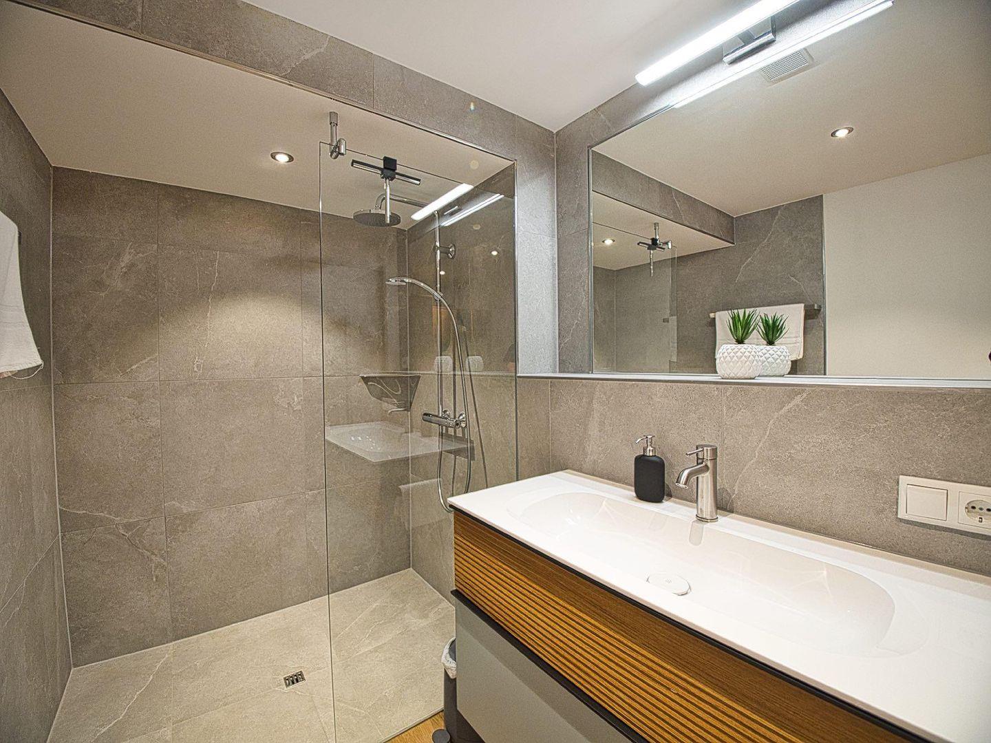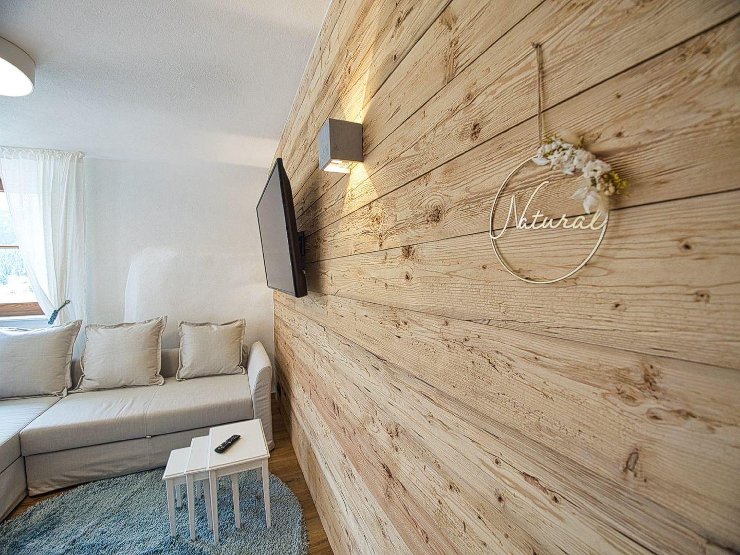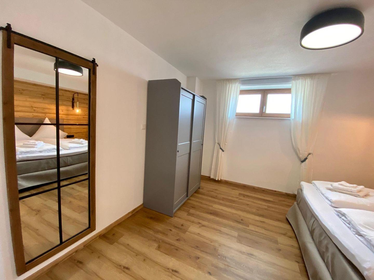 Im Schlafzimmer sorgt ein komfortables Boxspringbett für erholsamen Schlaf. Das offen gestaltete Badezimmer mit bodengleicher Dusche schließt direkt an, ein separates WC mit Waschmaschine bietet zusätzlichen Komfort – auch für längere Aufenthalte oder Workation in den Alpen. Schnelles Internet ist selbstverständlich vorhanden.