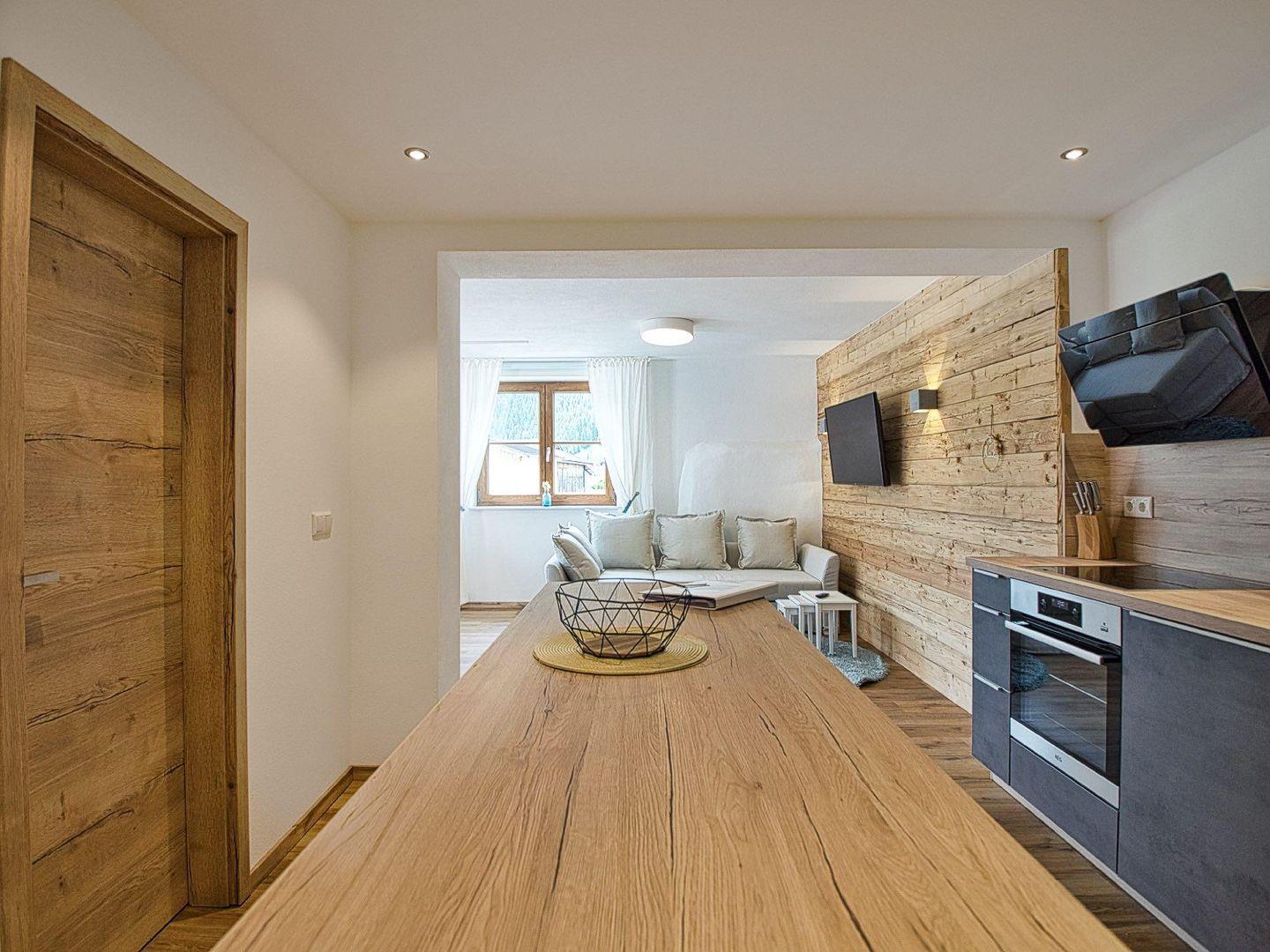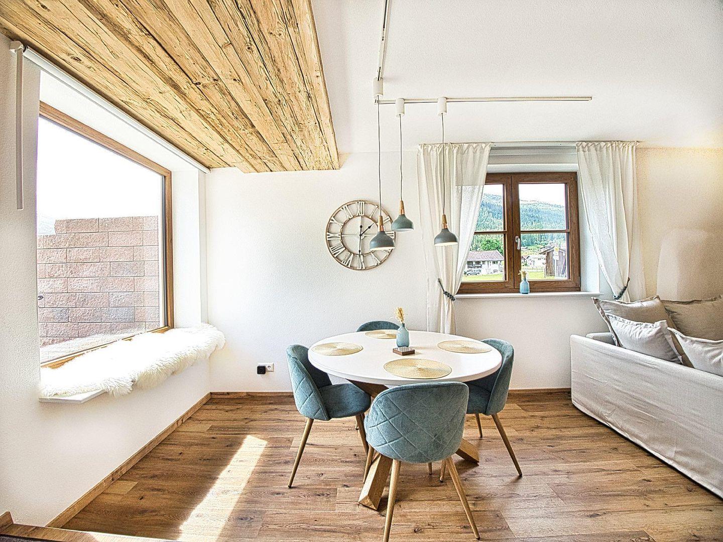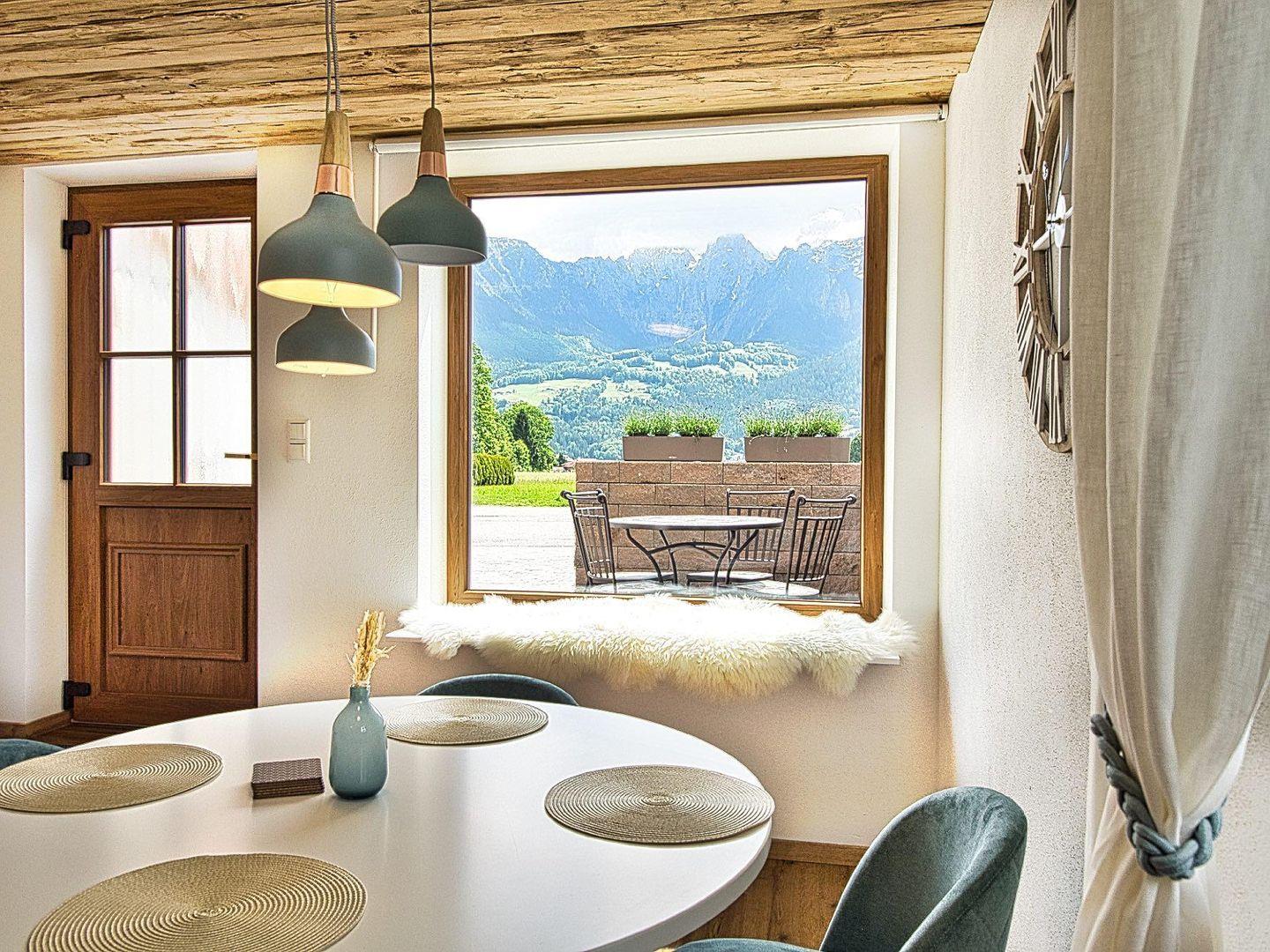 Der offen gestaltete Wohn- und Essbereich bildet das Herzstück der Wohnung. Warme Holzelemente, eine hochwertige Einrichtung und große Fenster schaffen eine angenehme, ruhige Wohnatmosphäre. Vom Essplatz und der Sitzecke aus öffnet sich der Blick auf die umliegende Bergwelt mit dem markanten Hoher Göll – ein Panorama, das den Alltag schnell vergessen lässt. Das ausziehbare Schlafsofa bietet bei Bedarf zusätzlichen Platz.