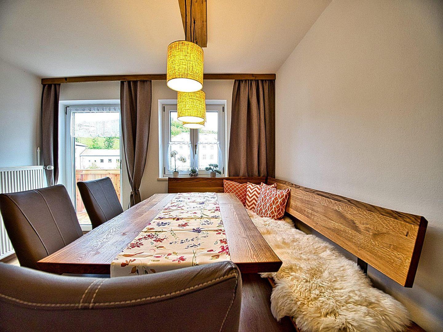 Die Wohnung verfügt über einen eigenen Eingang und verbindet alpinen Charme mit funktionalem Wohnkomfort. Warme Holzelemente schaffen eine gemütliche Atmosphäre, ohne auf Alltagstauglichkeit zu verzichten. Herzstück ist der großzügige Wohnbereich mit Sofa, Smart-TV, offen gestalteter Küche und angrenzendem Essplatz – perfekt für gemeinsames Kochen, Essen und Zusammensein.