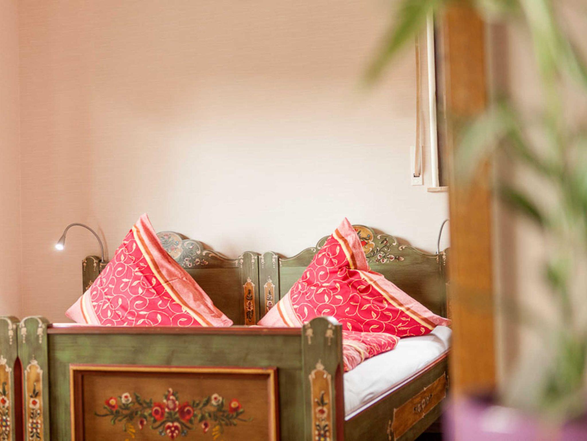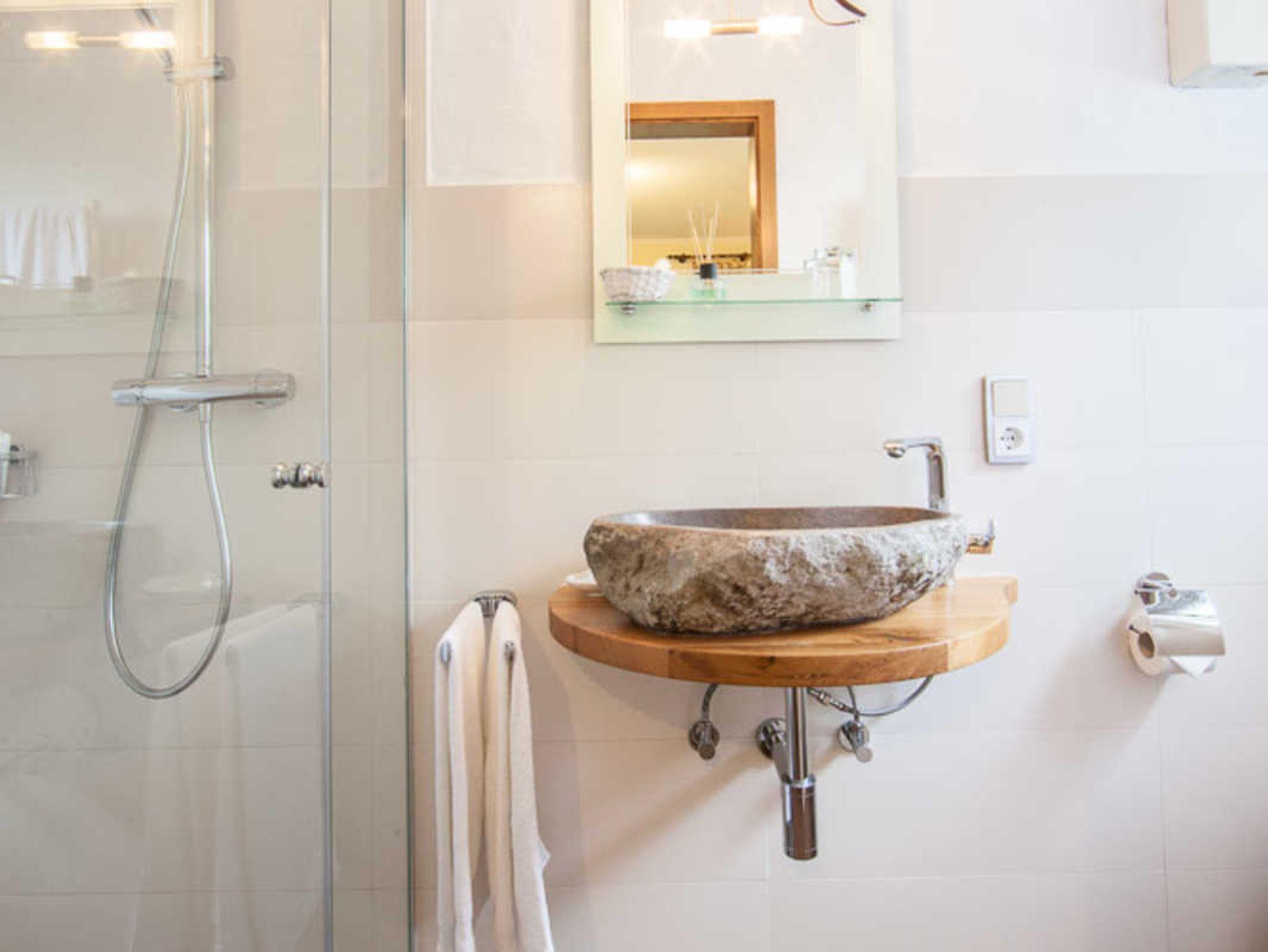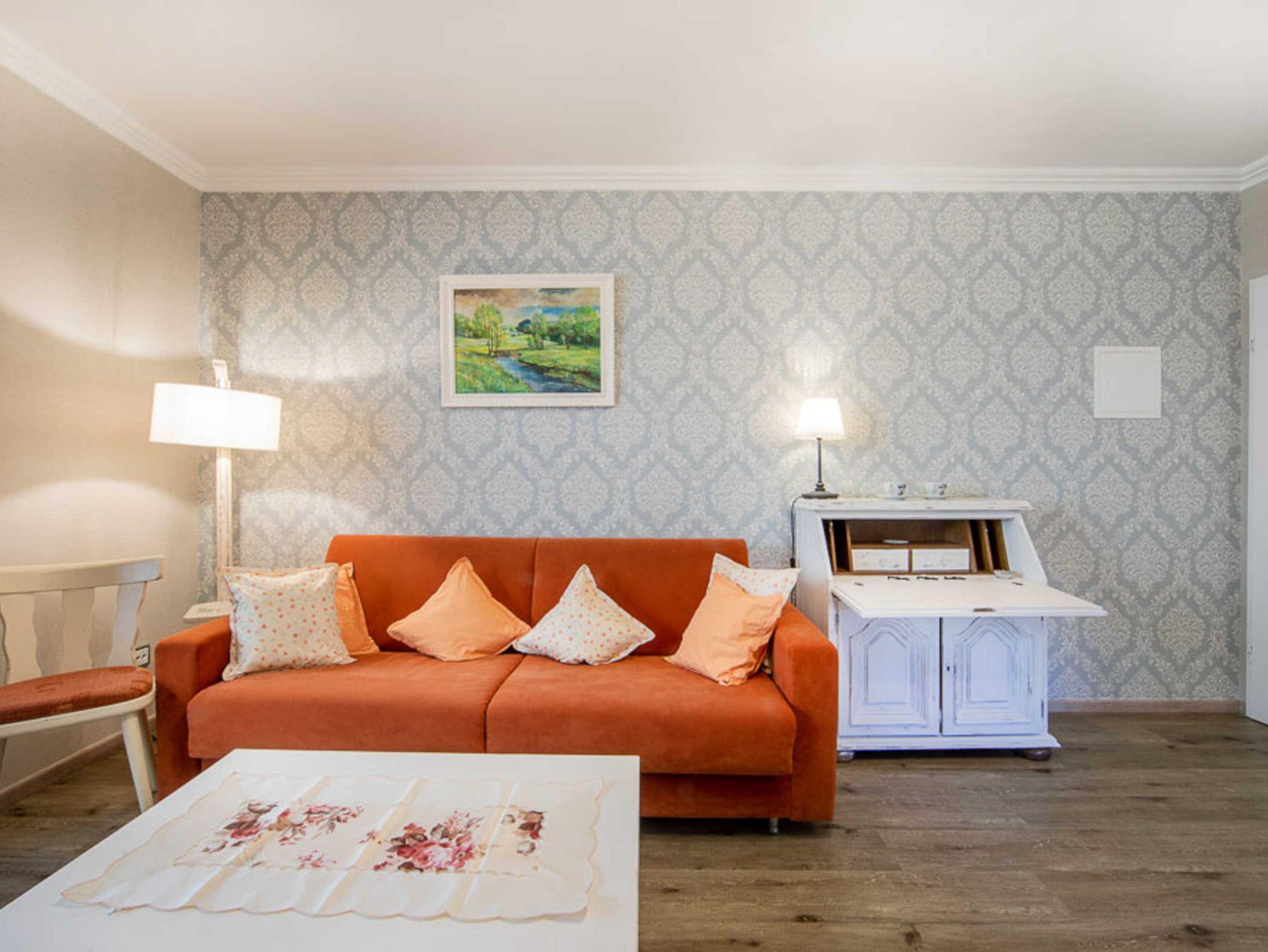 ein modernes Bad mit großer ebenerdiger Dusche, ein gemütlich gestalteter Schlafraum und ein abgetrennter Wohnbereich mit einem Sofa, welches sich bei Bedarf in ein vollwertiges Doppelbett verwandelt. Handgearbeitete Möbel und Wohnaccessoires geben dieser Suite ihr unverwechselbares Wohlfühlambiente.