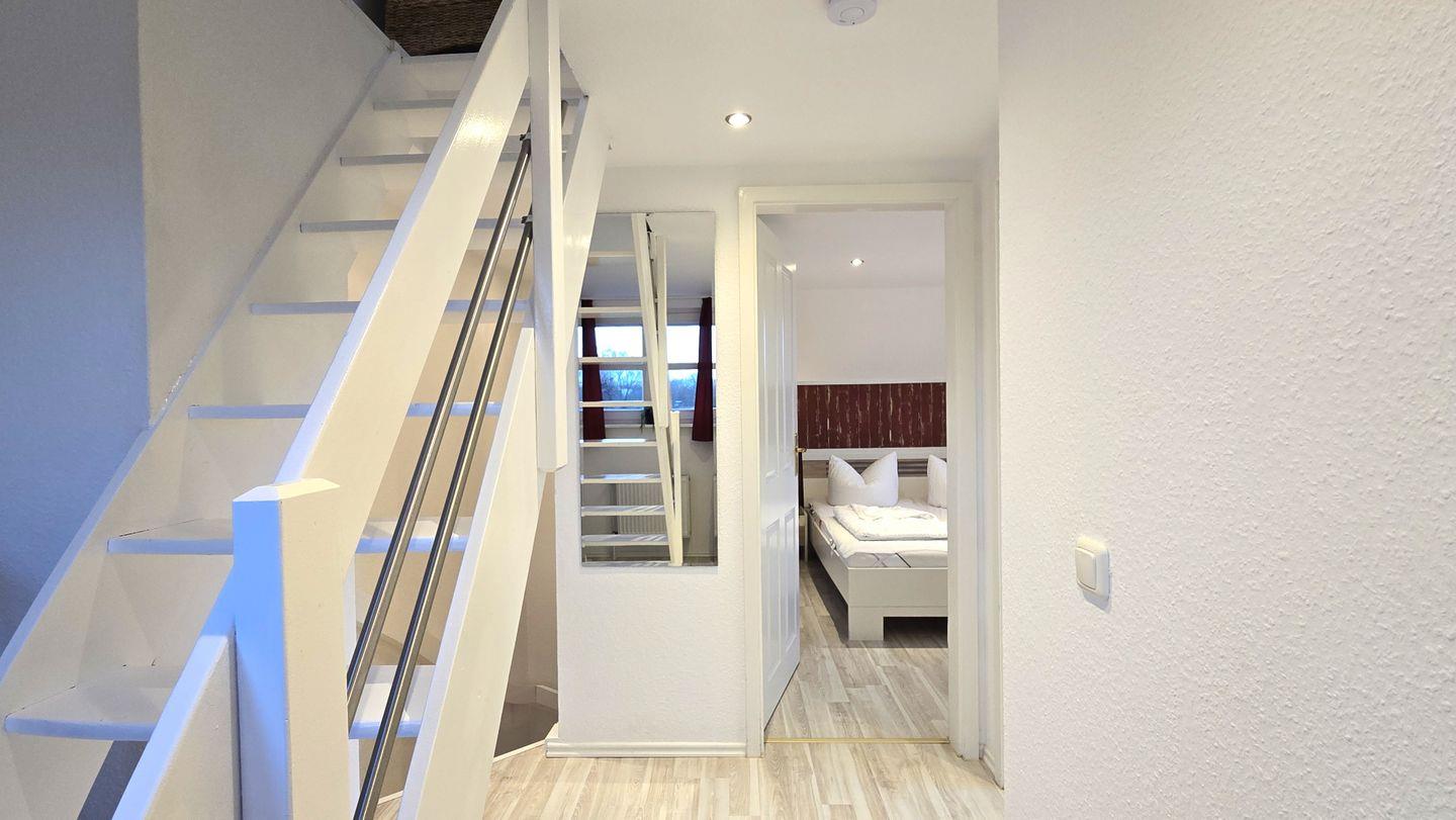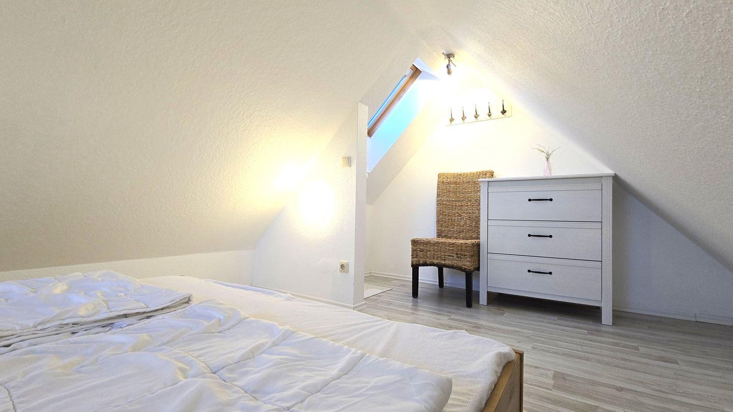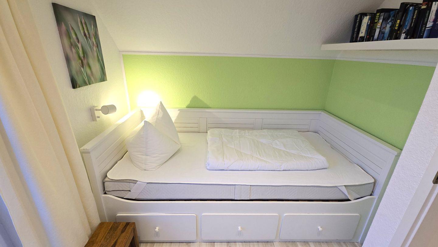 Schlafzimmer III (in der Galerie, über eine steilere Treppe erreichbar und offen zum drunterliegenden Flur): großes Einzelbett / Kommode
