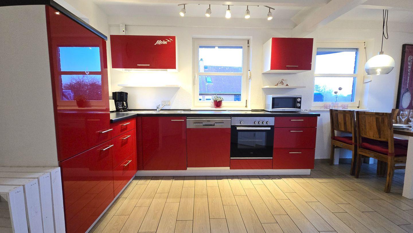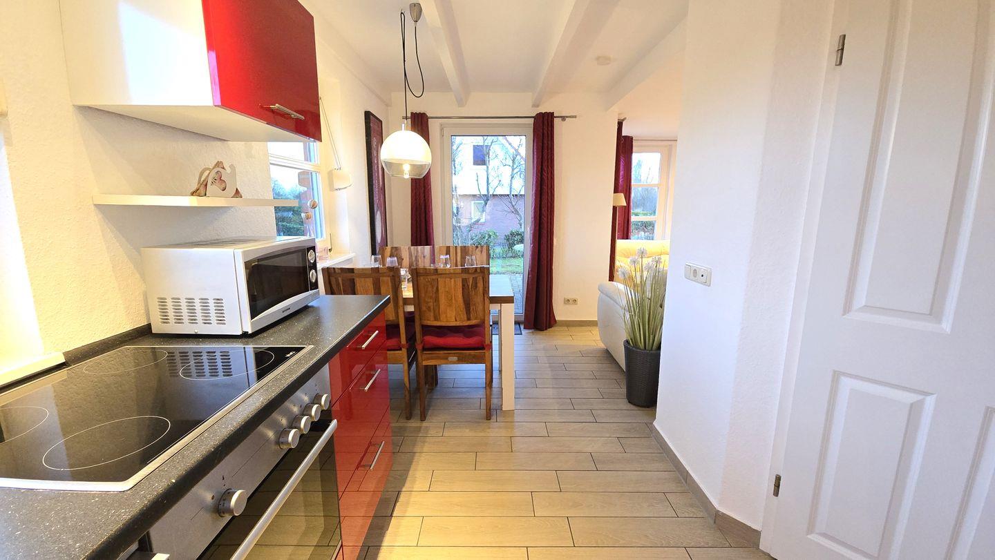Küche: große Küche / Cerankochfeld / Backofen / Geschirrspüler / Kaffeemaschine / Wasserkocher / Mikrowelle / Kühlschrank / Gefrierschrank / Toaster / Esstisch mit 4 Stühlen