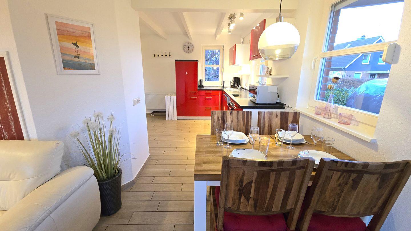 Das modern und liebevoll eingerichtete Ferienhaus besticht durch ein offenes Wohnkonzept, das gesellige Stunden mit Familie oder Freunden ermöglicht. Die voll ausgestattete Küche, ein gemütlicher Essbereich und der lichtdurchflutete Wohnraum laden zum gemeinsamen Kochen, Essen und Entspannen ein. Drei separate Schlafzimmer sorgen für erholsamen Schlaf – ideal für Familien mit Kindern oder kleine Gruppen. Das moderne Duschbad rundet das komfortable Innenleben ab.