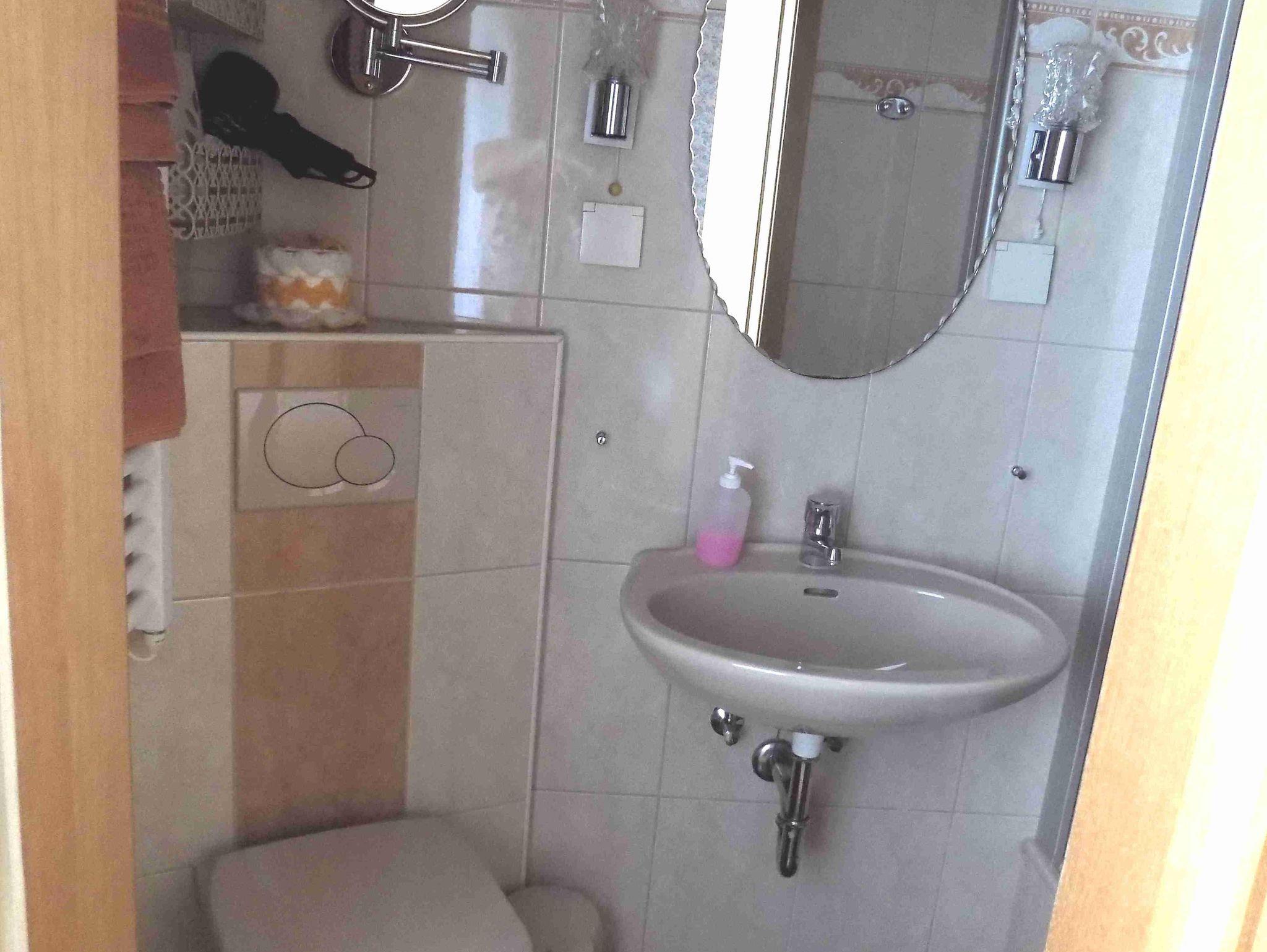 Dusche/WC: Föhn, Kosmetikspiegel, Handtücher, Seife, Toilettenpapier