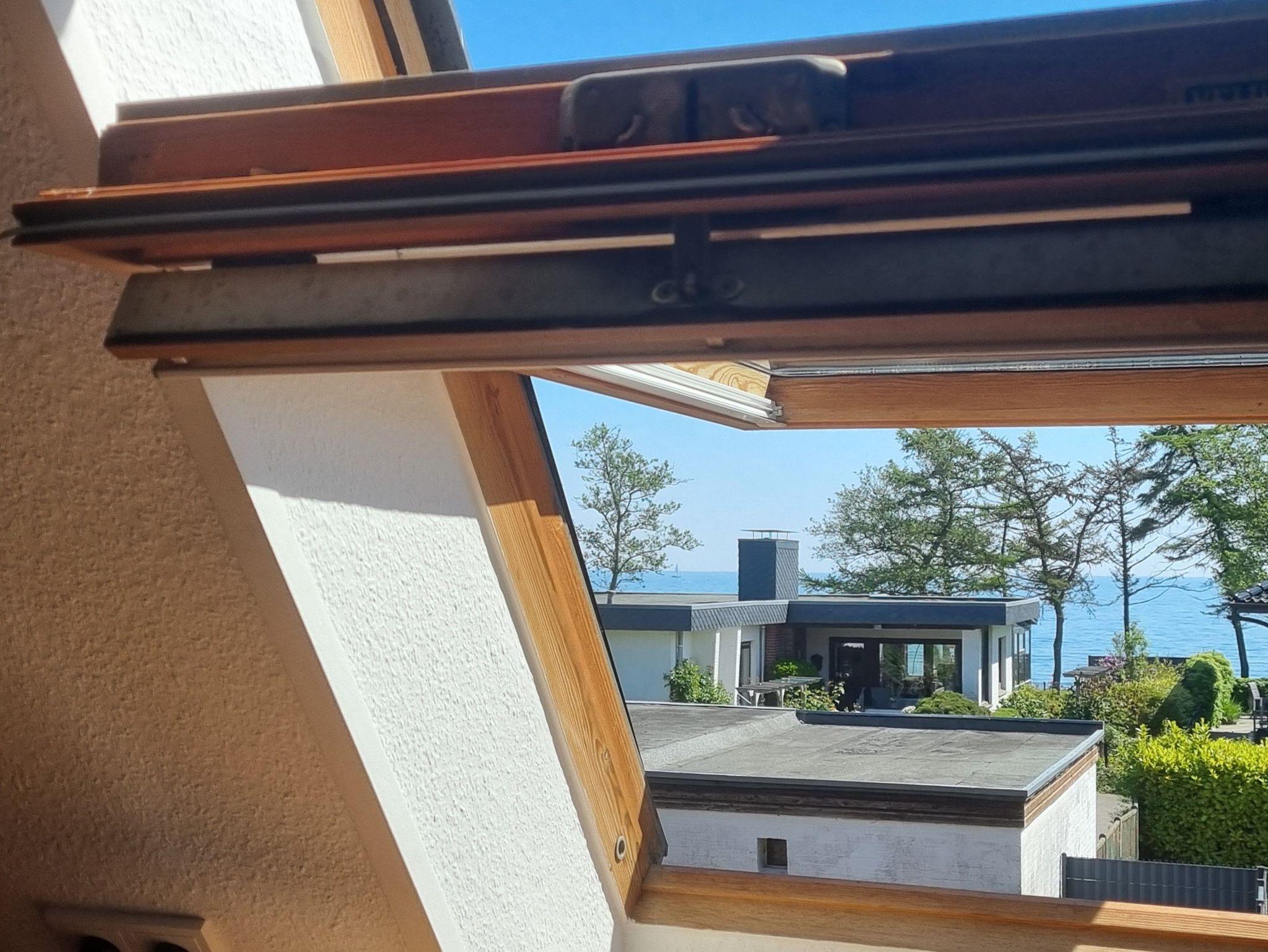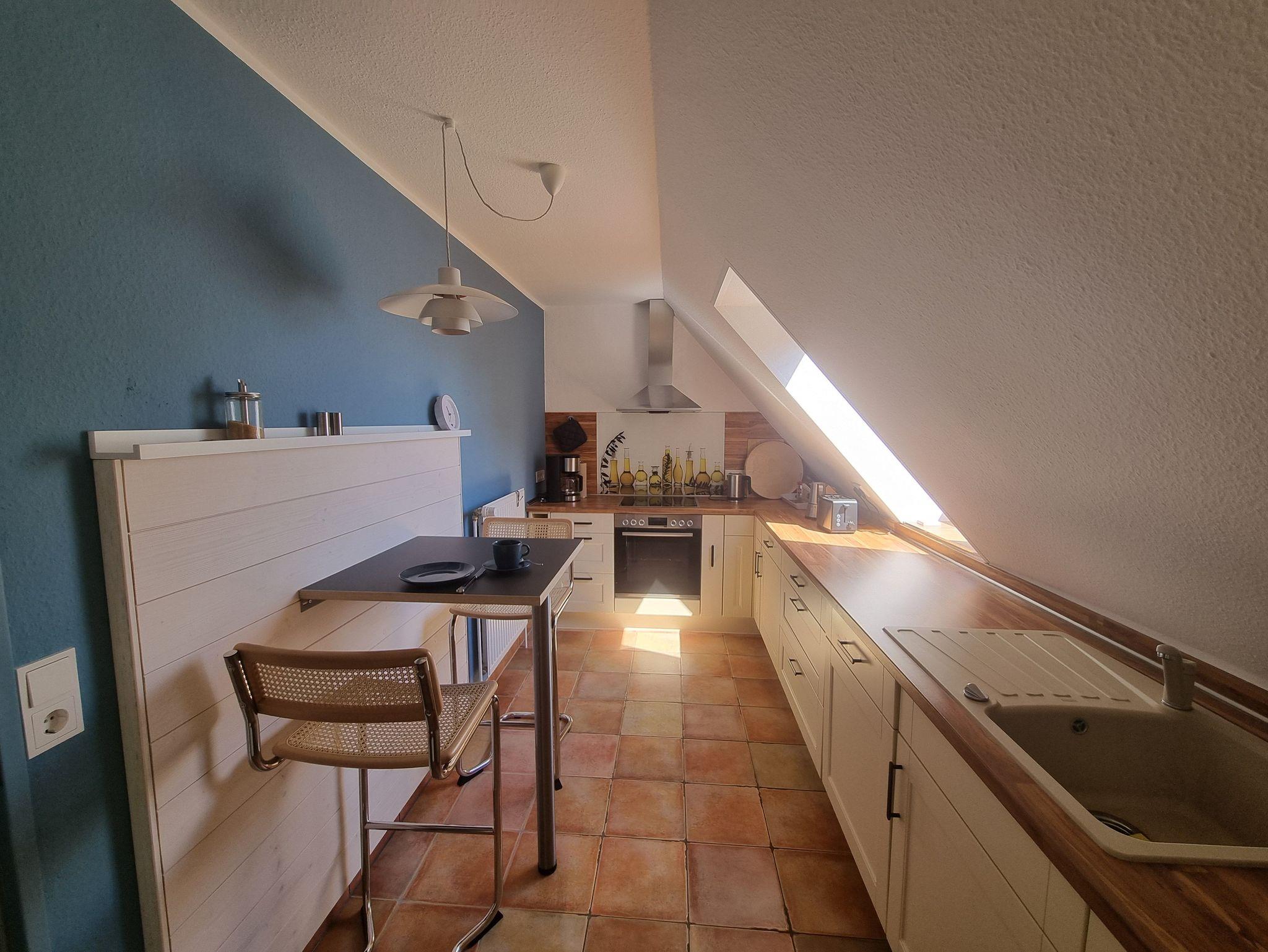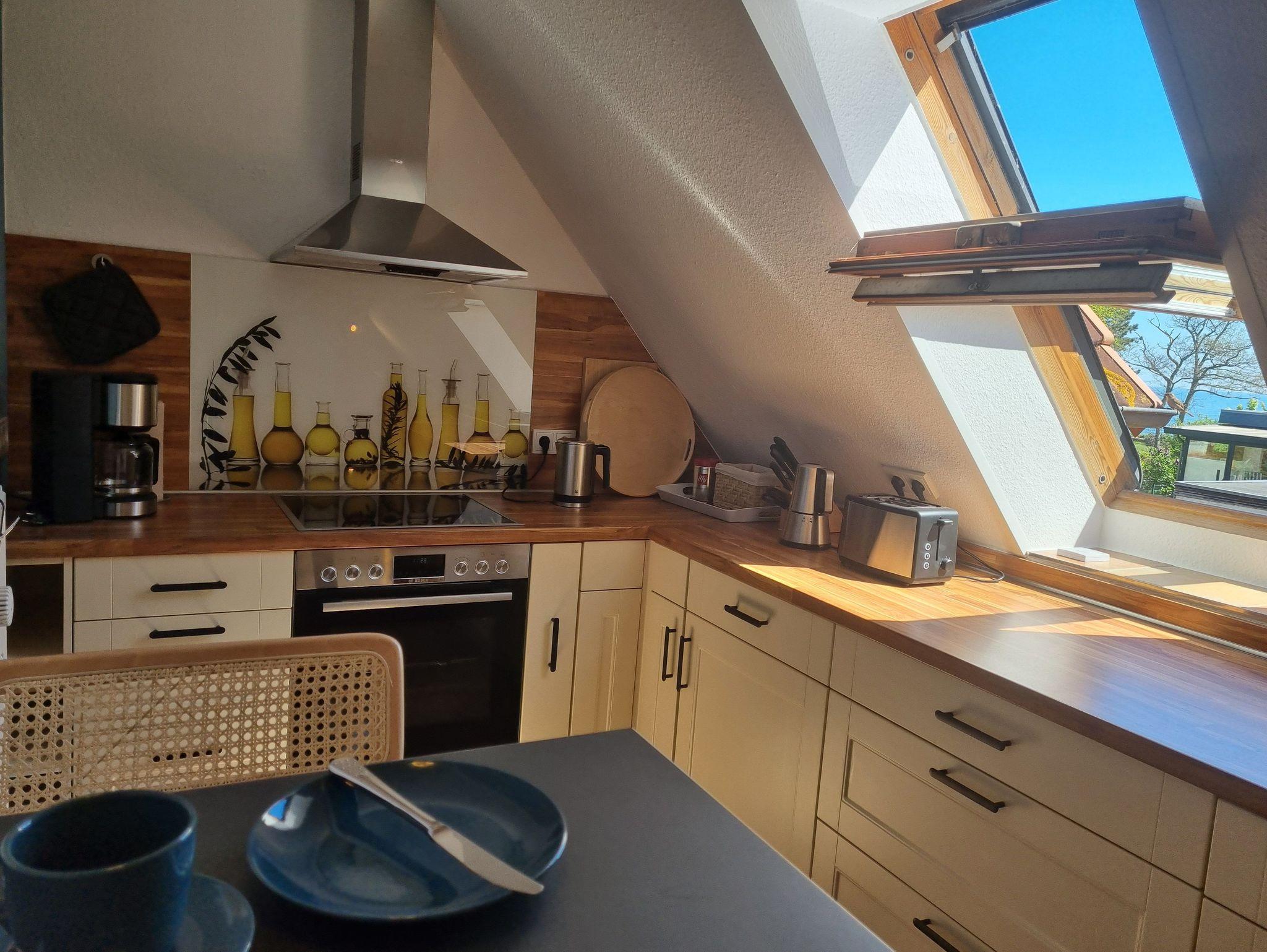 Die separate, voll ausgestattete Küche verfügt über einen Essplatz für 2 Personen, von dem aus man einen Blick auf die Ostsee genießen kann.