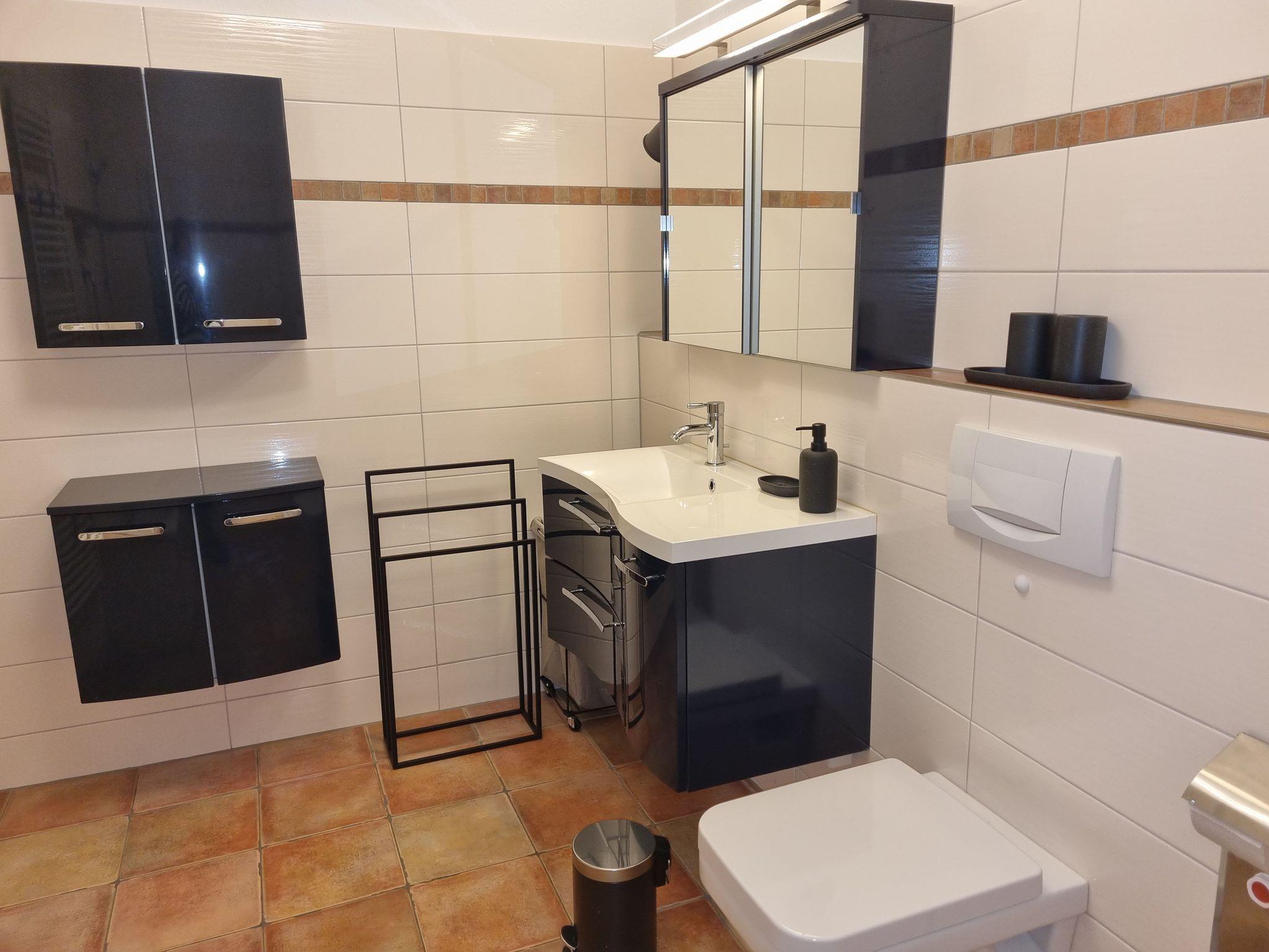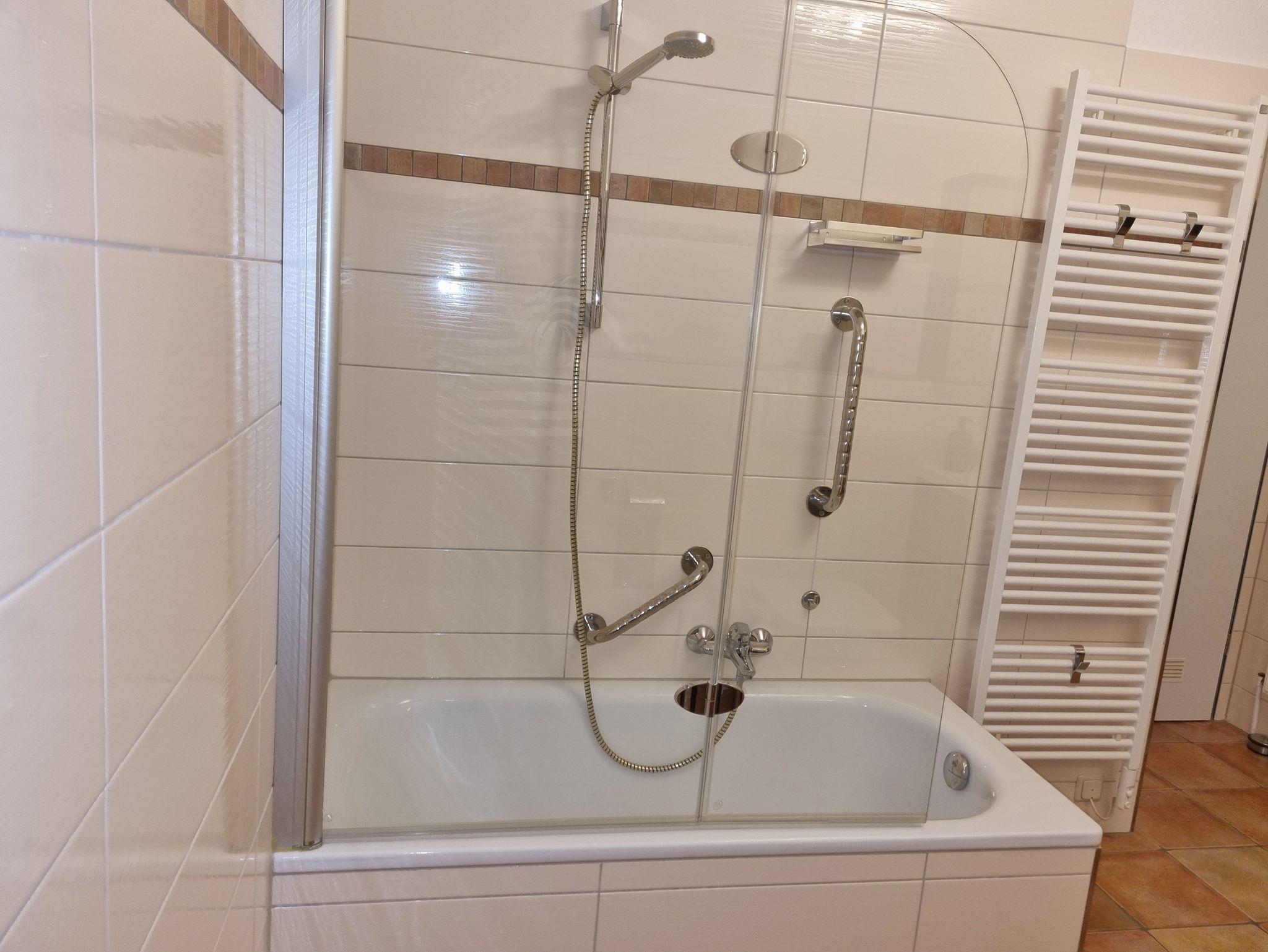 Das großzügige Badezimmer verfügt über eine Badewanne mit Dusche, WC und ausreichend Platz für Ihre Utensilien.