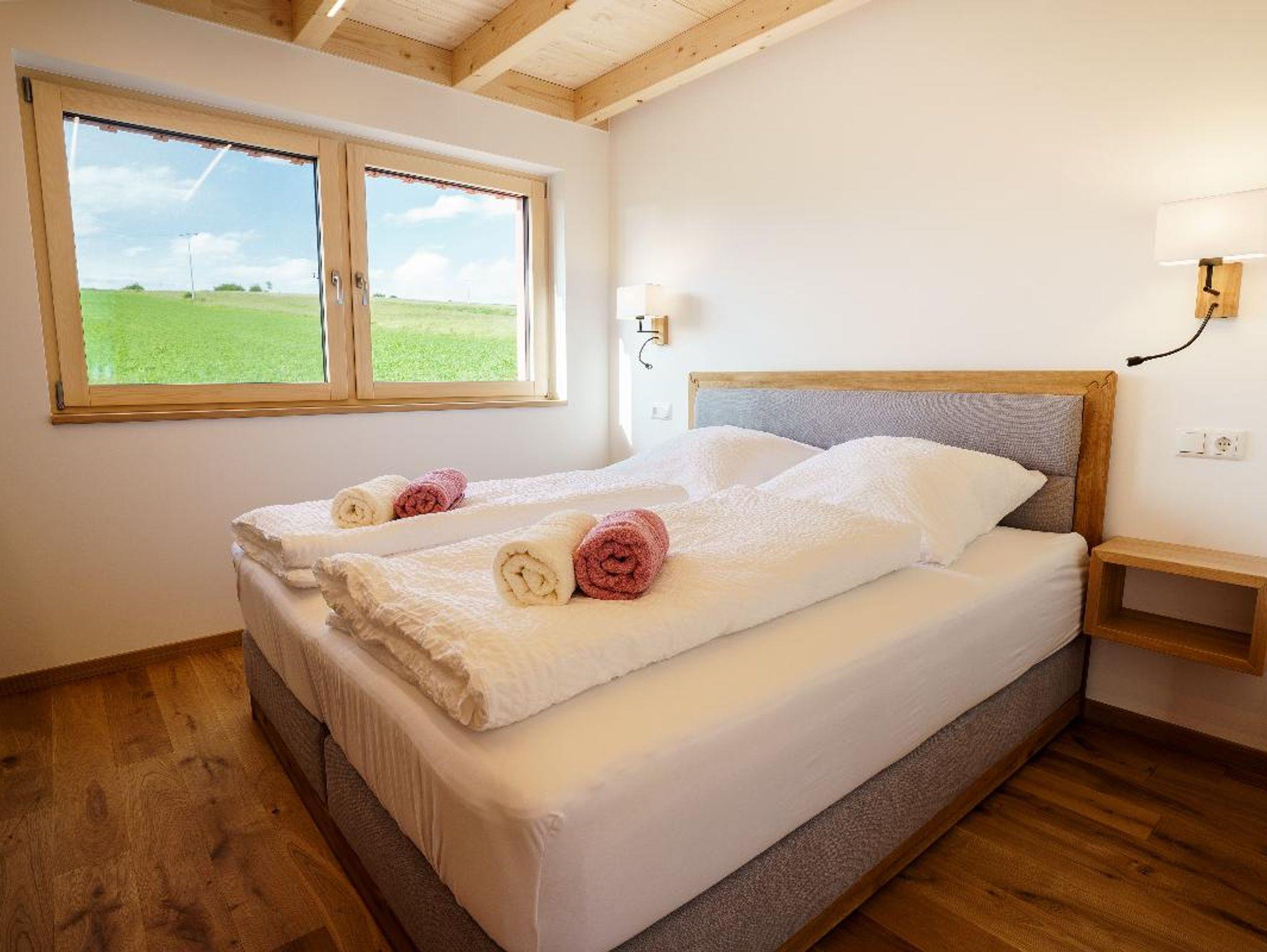 Auf 80?Quadratmetern finden bis zu fünf Personen Platz. Ein gemütliches Elternschlafzimmer mit Boxspringbett befindet sich im Erdgeschoss, zwei weitere Schlafzimmer mit Einzelbetten – eines davon mit zusätzlichem Schlafsessel für ein Kind – liegen im Obergeschoss. Herzstück des Hauses ist der helle Wohn- und Essbereich mit großer Fensterfront, offener Galerie und voll ausgestatteter Küche. Das moderne Bad verfügt über eine begehbare Regendusche, Fußbodenheizung sorgt für behagliche Wärme. Auf der großzügigen Terrasse lädt ein beheizter Außen-Whirlpool zum Entspannen ein – mit Blick auf die stille Natur ringsum.
